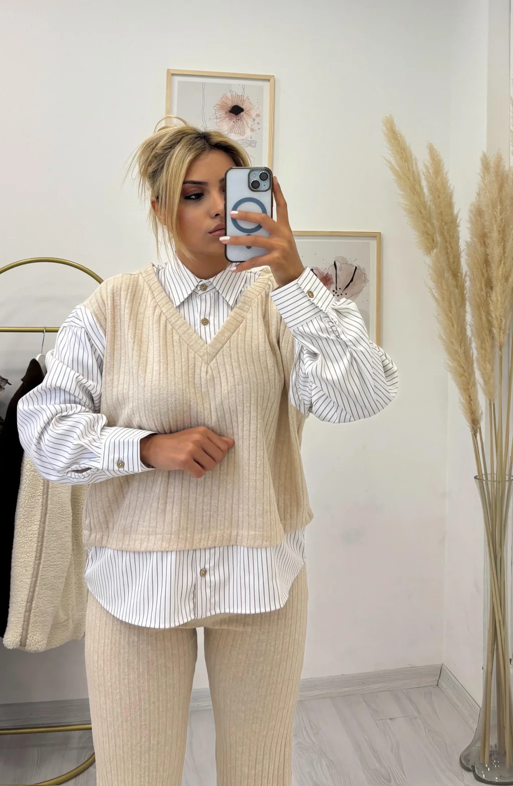 Kış aylarının en trend parçalarından olan 3 Parçalı Takım. Fitilli triko ipliğiyle örülmüş V Yaka Yelek ve Geniş Paça Pantolon'dan oluşur. Takıma dahil olan Çizgili Gömlek ile kombinlenerek şık ve bütünsel bir görünüm sunar. Tüm parçalar Ekru/Bej tonlarındadır."