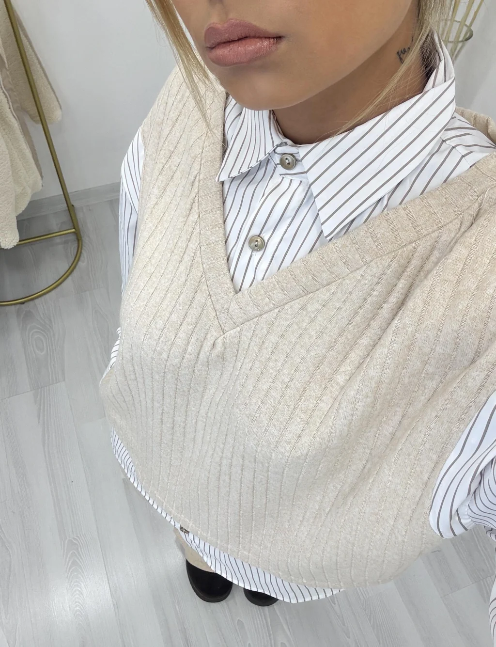 Detay: Geniş kesimli, uzun kollu pamuklu kumaş gömlek. Yelek ile bütünleşen ince çizgili desene sahiptir.
