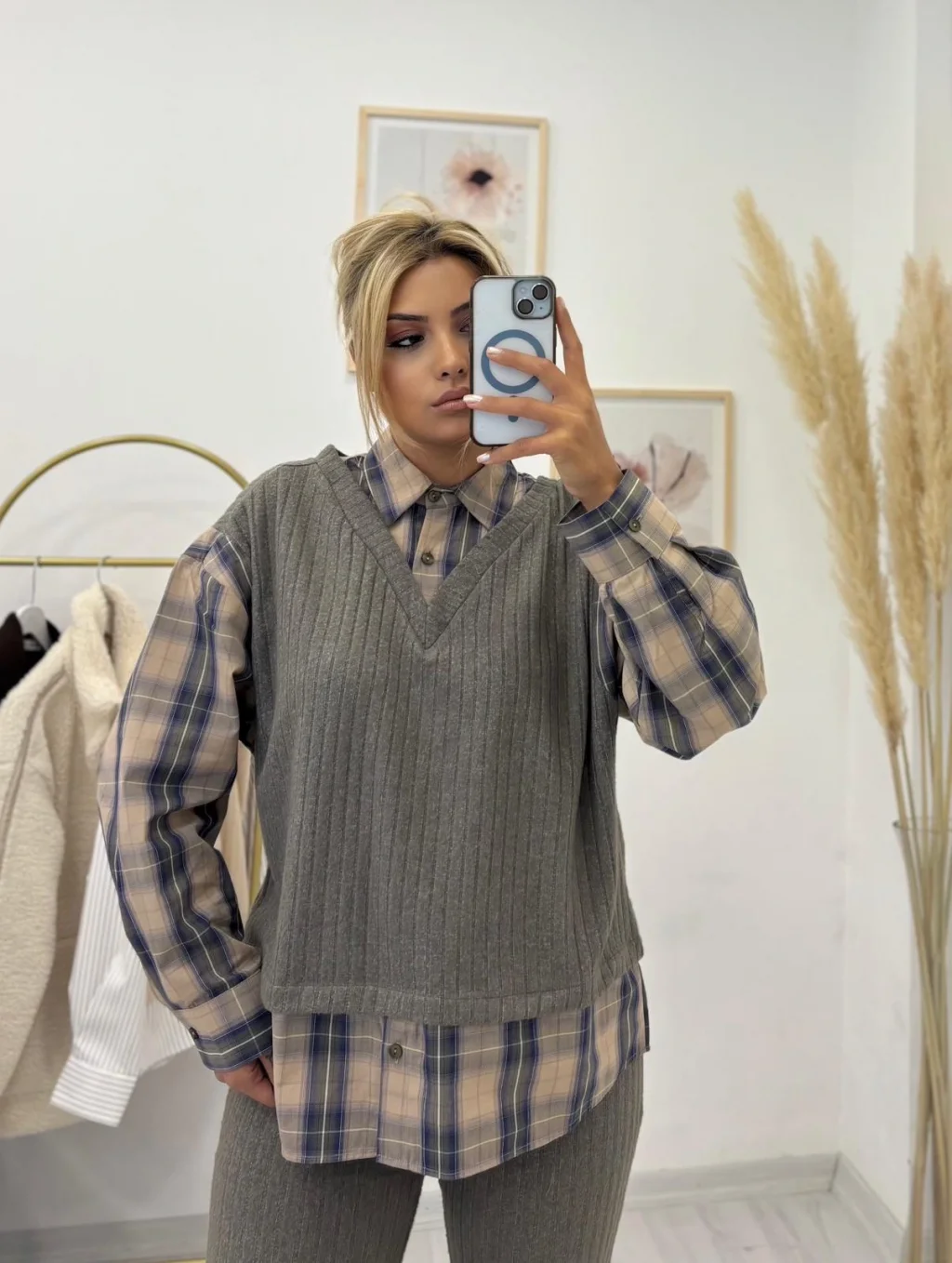 Detay: Geniş kesimli, uzun kollu gömlek. Yelek ile bütünleşen ekose/kareli desene sahiptir. Desende Haki, Lacivert ve Bej tonları hakimdir.