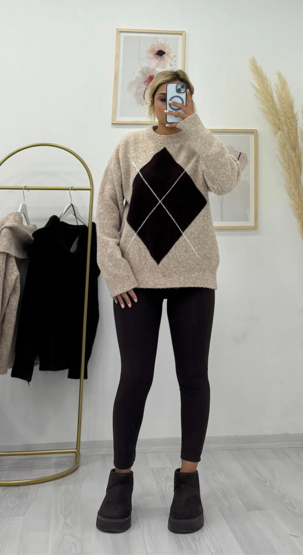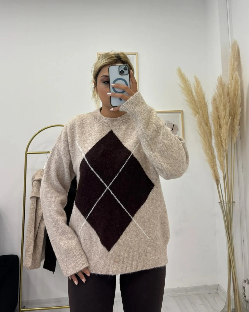 Argyle Desenli Oversize Bej Kazak, Açık Bej'in aydınlığını kışlık bordo/kahve tonuyla birleştirir. Yumuşak tuşesi ve zarif baklava deseniyle sonbahar-kış sezonunun şık ve konforlu parçasıdır.