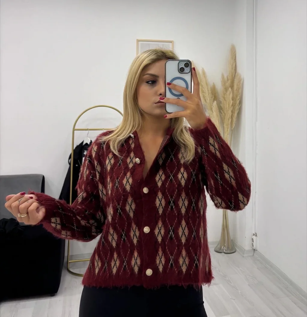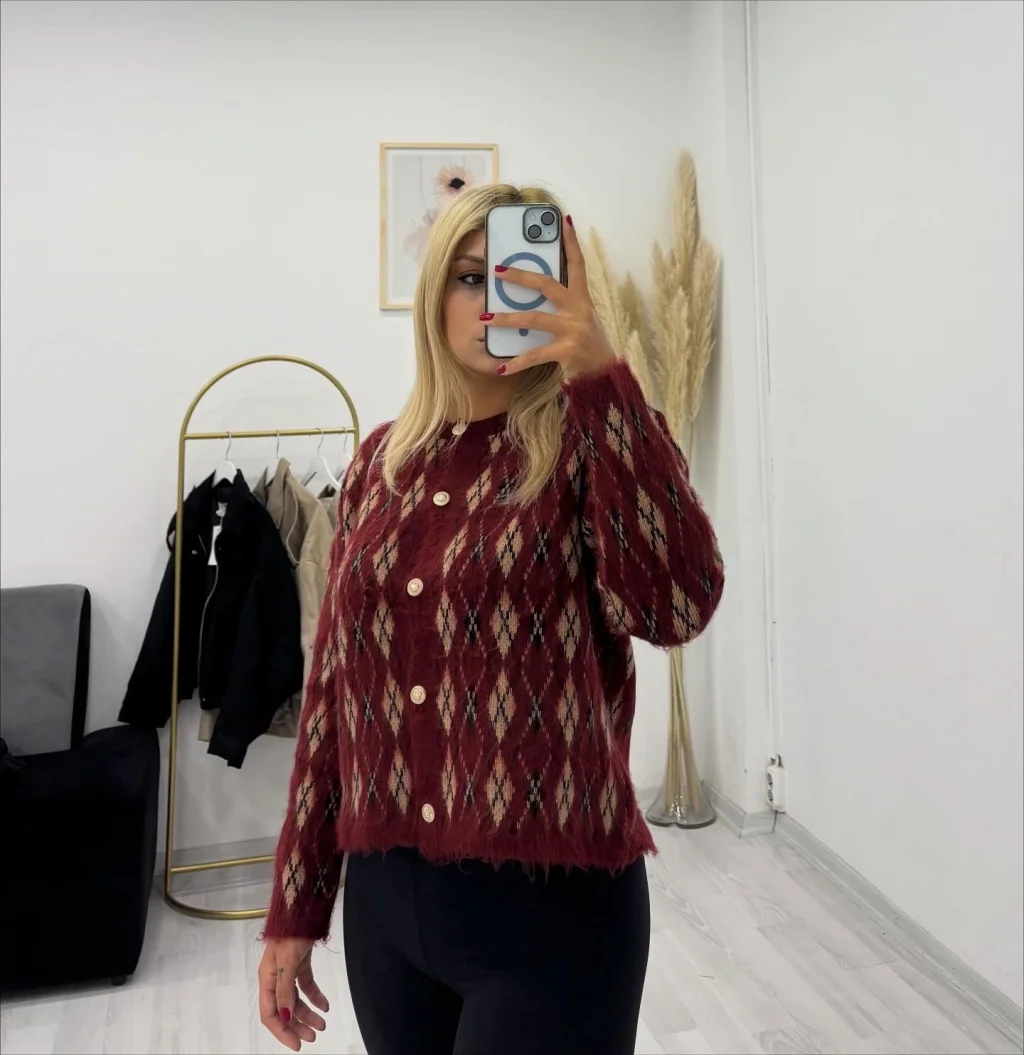 Klasik ve modern görünümü bir araya getiren bu Baklava Desenli Düğmeli Hırka, kış ve sonbahar gardırobunuzun yıldız parçası olmaya aday. Yumuşak ve sıcak tutan triko dokusu sayesinde üstün konfor sunar. Ön kısmında bulunan şık düğmeleri ve belirgin baklava deseni, hırkaya zarif bir hava katarken, hem günlük hem de şık kombinleriniz için ideal bir tamamlayıcıdır. Vücudu saran rahat kesimi sayesinde tişörtleriniz veya gömlekleriniz üzerine rahatlıkla giyilebilir."