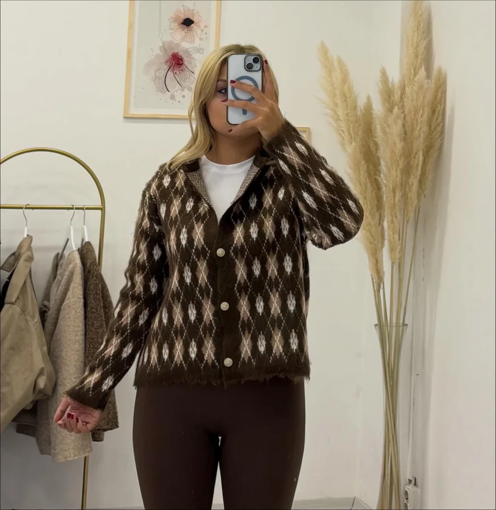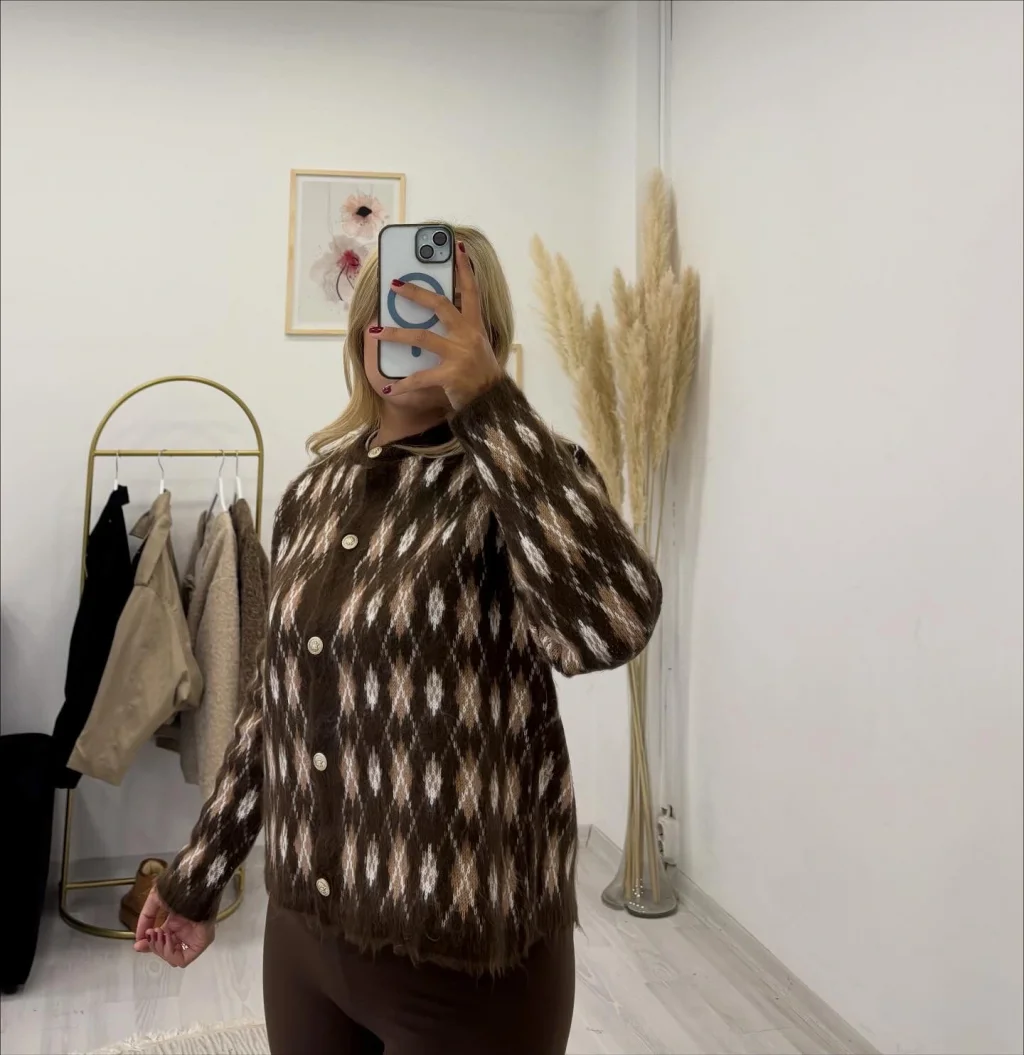Klasik ve modern görünümü bir araya getiren bu Baklava Desenli Düğmeli Hırka, kış ve sonbahar gardırobunuzun yıldız parçası olmaya aday. Yumuşak ve sıcak tutan triko dokusu sayesinde üstün konfor sunar. Ön kısmında bulunan şık düğmeleri ve belirgin baklava deseni, hırkaya zarif bir hava katarken, hem günlük hem de şık kombinleriniz için ideal bir tamamlayıcıdır. Vücudu saran rahat kesimi sayesinde tişörtleriniz veya gömlekleriniz üzerine rahatlıkla giyilebilir."