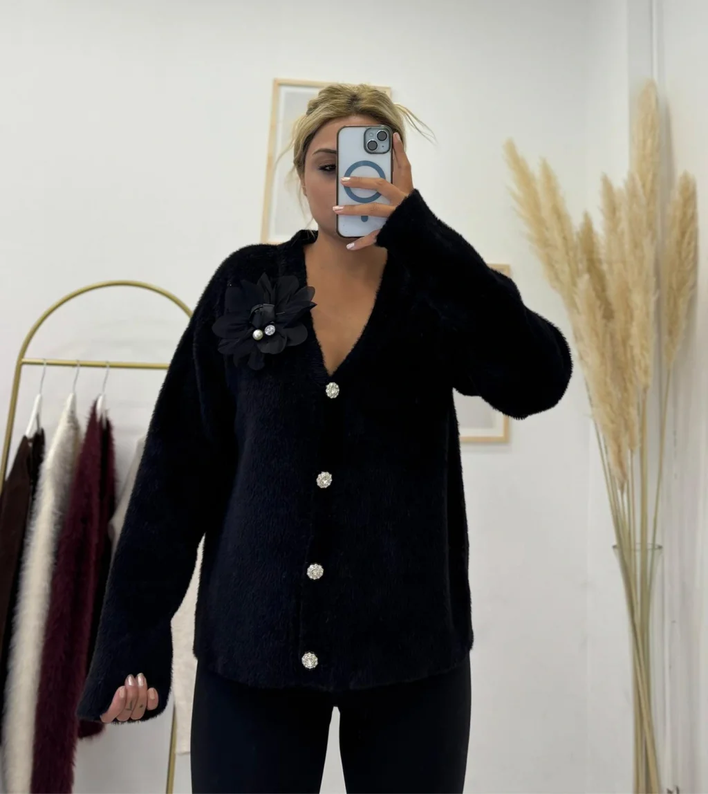 Lüks ve yumuşak tüylü (fuzzy) dokuya sahip, şık V yaka triko hırka. Önündeki parlak taş detaylı düğmeler ve zarif siyah çiçek broşu ile dikkat çeker. Göz alıcı siyah rengindedir.
