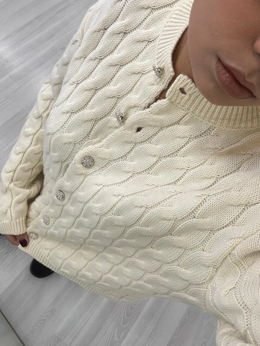 Zarif Detay: Klasik bisiklet yaka kesimi sadeliği korurken, ön kısımda kullanılan büyük, parlak ve göz alıcı taşlı düğmeler, hırkaya anında sofistike ve mücevher havası katar. Bu düğmeler, ürünü günlük kullanımdan özel akşam yemeği kombinlerine taşır.
