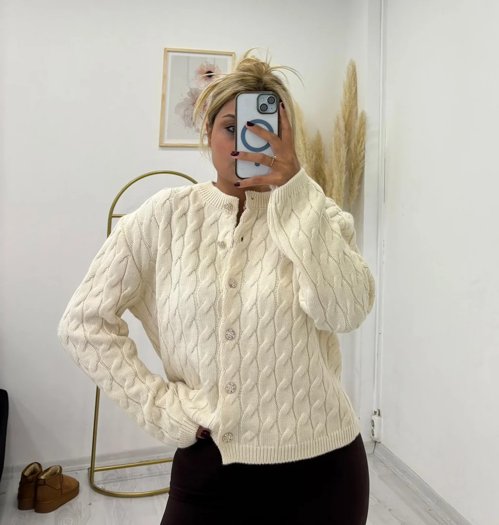Kalın burgu (saç örgüsü) desenli, bisiklet yaka triko hırka. Ön kısmında kullanılan parlak taşlı düğmelerle şık bir görünüm sunar. Siyah ve beyaz renkleri mevcuttur.