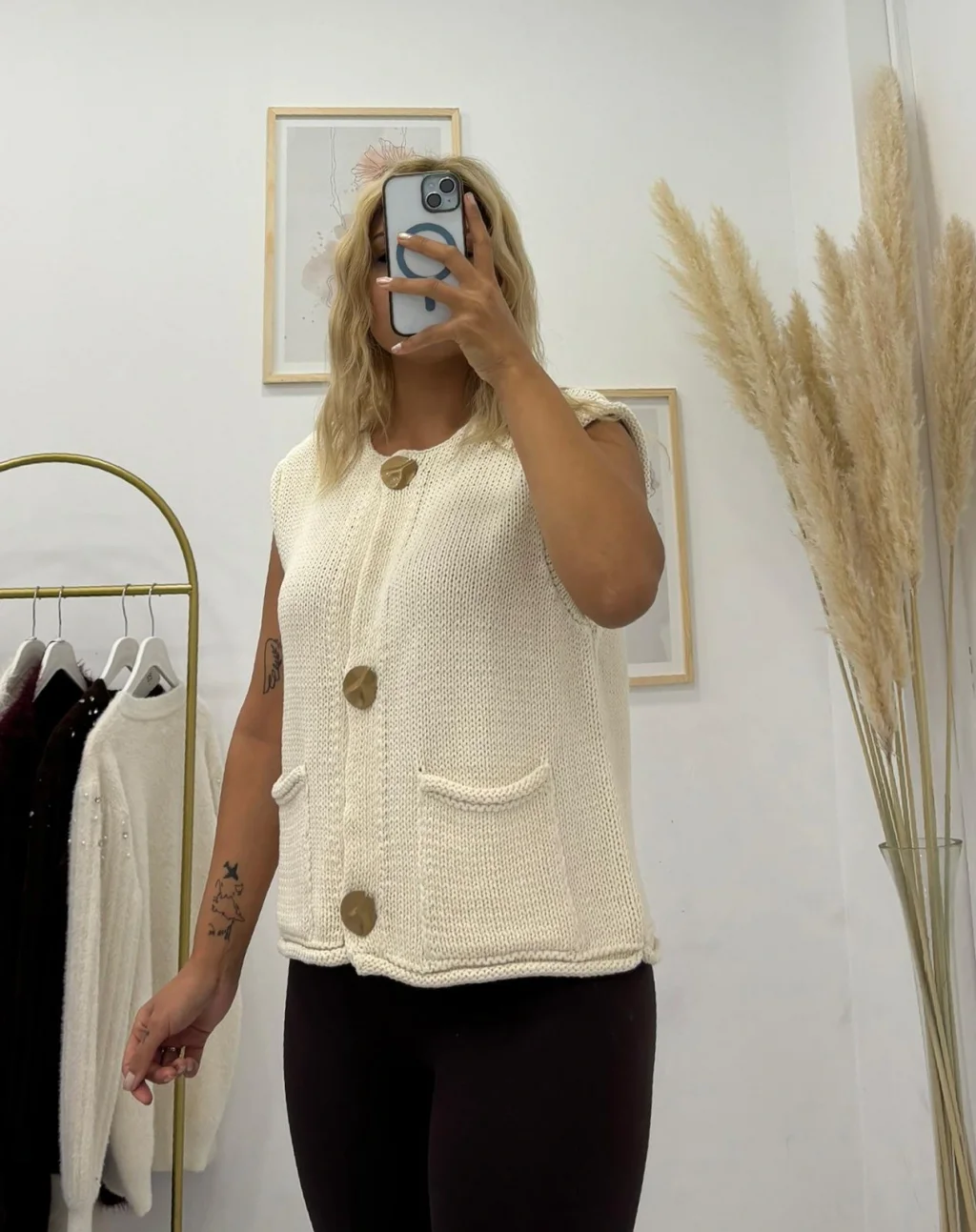 Büyük Gold Metal Düğmeli Kolsuz Triko Süveter/Yelek, gold detayların lüks dokunuşunu aydınlık Krem/Ekru tonuyla birleştiriyor. Katmanlı giyimde zarif, iddialı ve modern bir görünüm için idealdir.