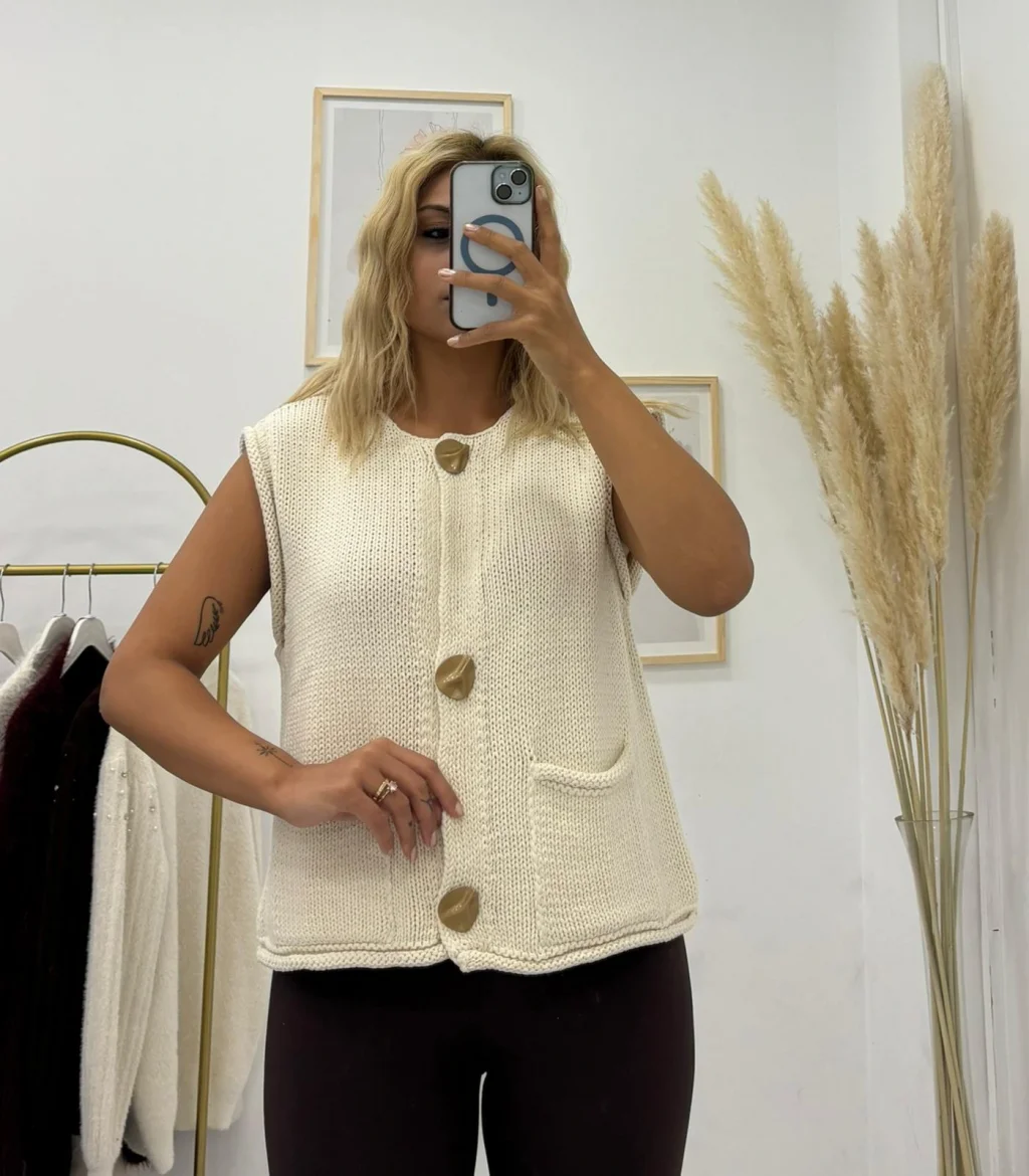 Krem/Ekru, düz örgü triko kumaştan yapılmış kolsuz süveter/yelek. Yuvarlak yaka ve ön kısmında kullanılan büyük, parlak gold metal düğmeler ile modern ve iddialı bir stil sunar.
