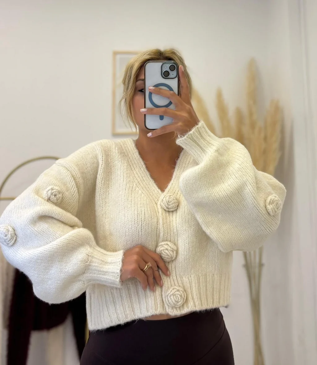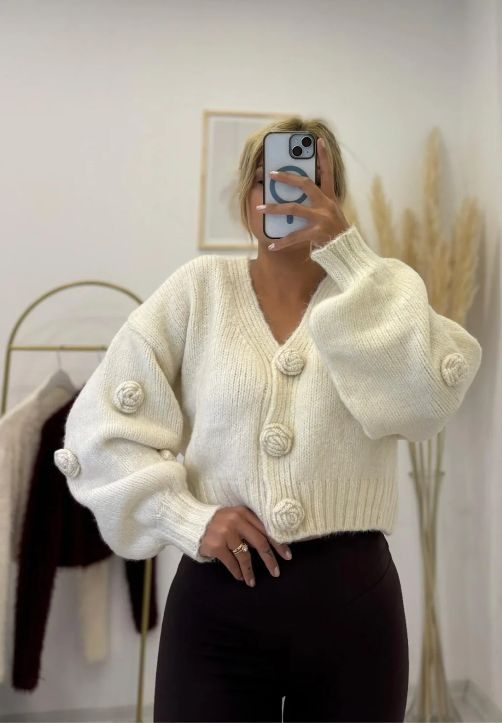 Kışın vazgeçilmezi olan Popcorn (Ponpon) Detaylı Ekru Crop Hırka ile lüks ve sofistike bir stil yakalayın. Ekru'nun (Krem) aydınlık tonu, bu hırkayı her sezon ve her renkle kolayca kombinlenebilir kılar. Kalın ve yumuşak örgü ipliği sıcaklık sağlarken, 3D büyük ponpon düğmeleri hırkaya benzersiz ve göz alıcı bir tasarım katar.