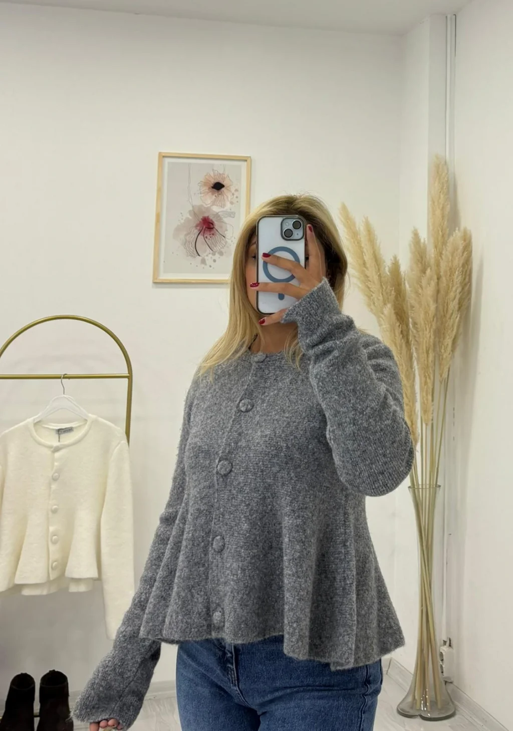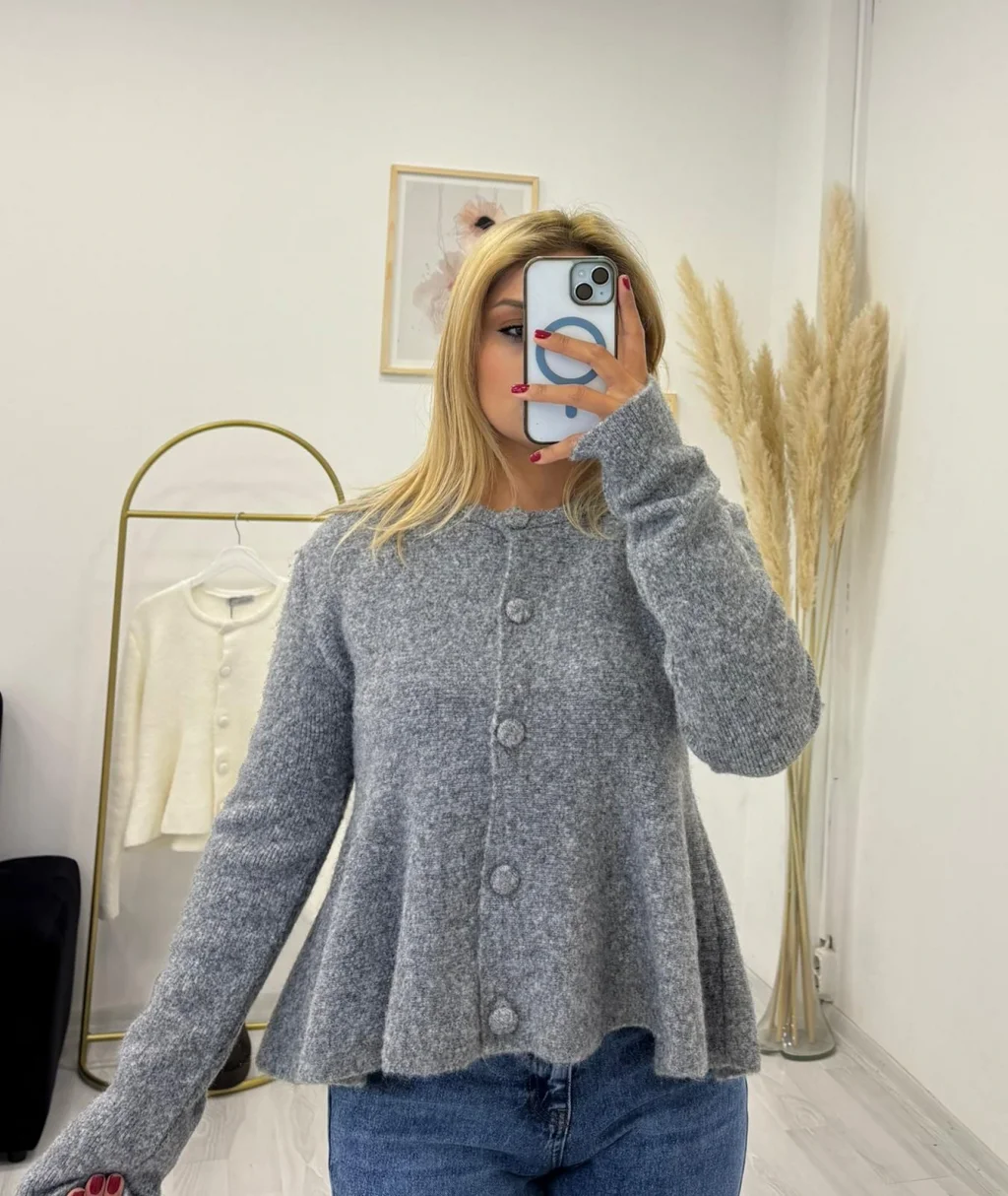 Bisiklet yaka, düğmeli ve yumuşak tüylü (angora/shaggy) dokuya sahip triko hırka. Belden aşağı çan şeklinde açılan peplum kesimiyle zarif bir görünüm sunar. Beyaz ve gri tonları mevcuttur.