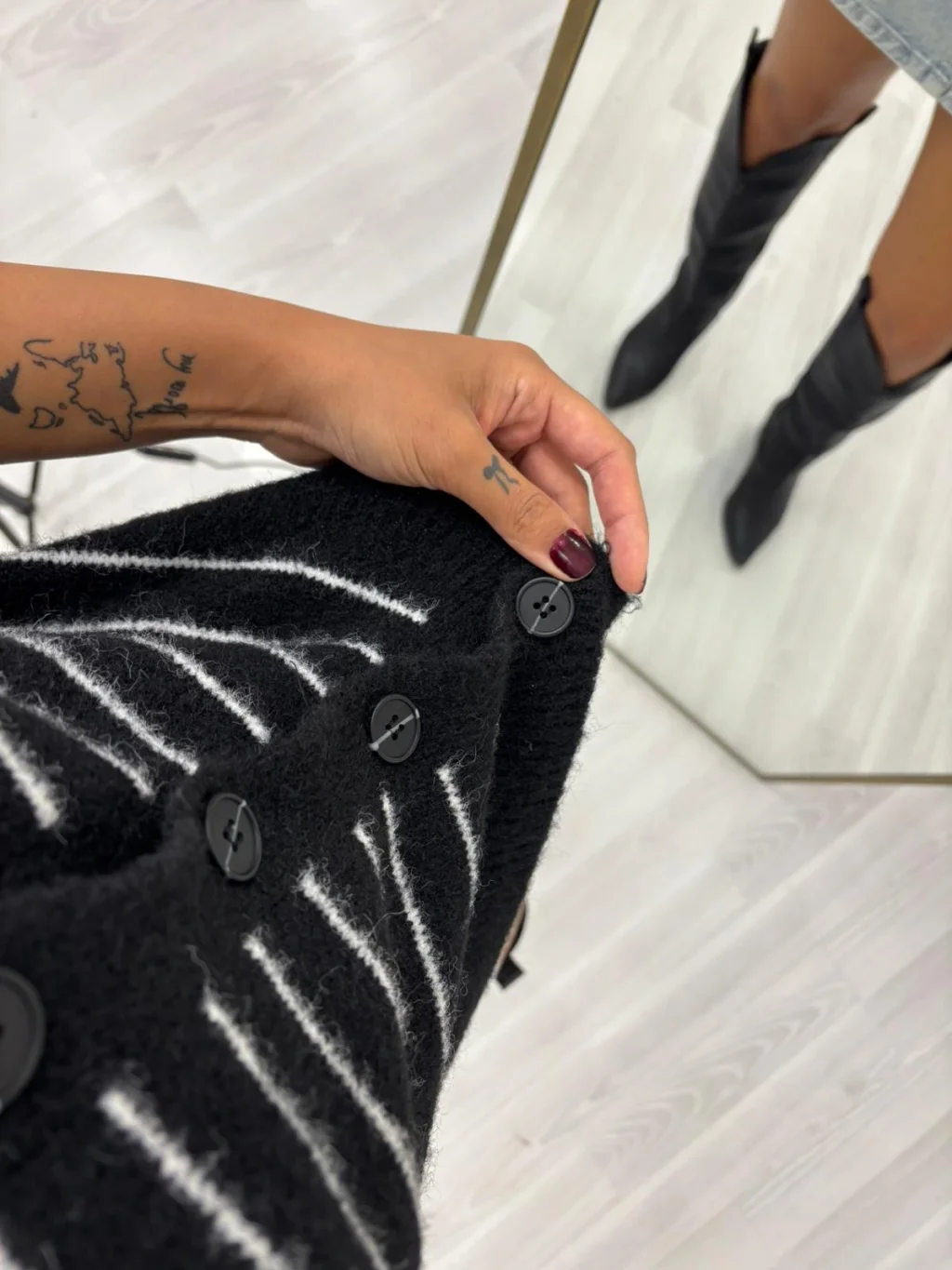 • Bisiklet yaka, yumuşak dokulu çizgili triko yelek. Önü düğmeli bu model, katmanlı kombinler için idealdir. Haki, siyah ve beyaz renk seçenekleriyle mevcuttur.