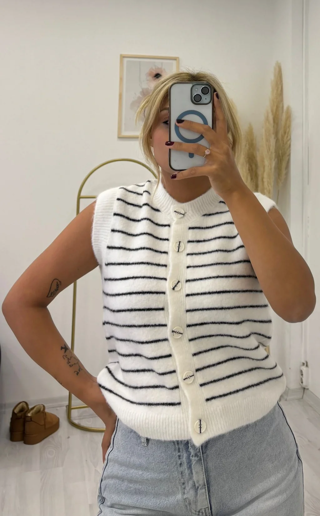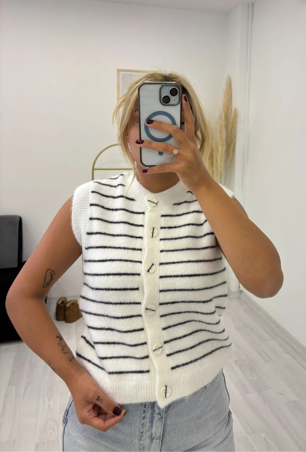 Bisiklet yaka, yumuşak dokulu çizgili triko yelek. Önü düğmeli bu model, katmanlı kombinler için idealdir. Haki, siyah ve beyaz renk seçenekleriyle mevcuttur.