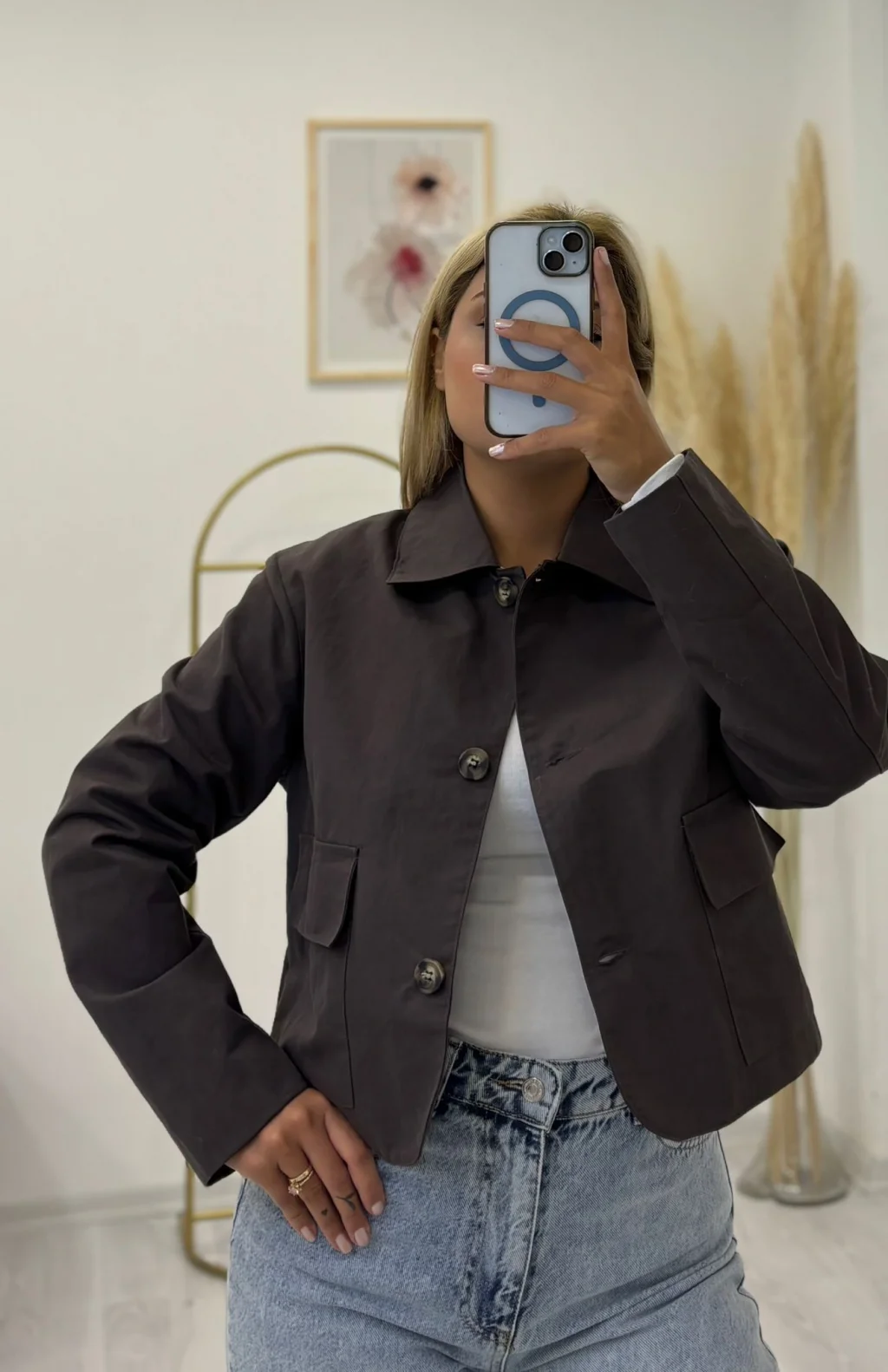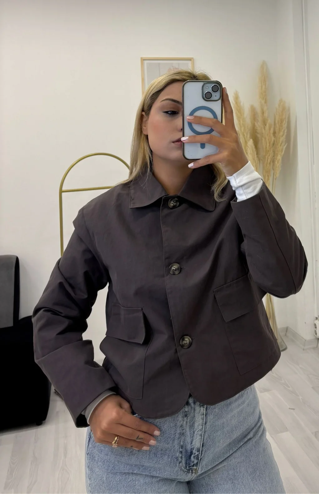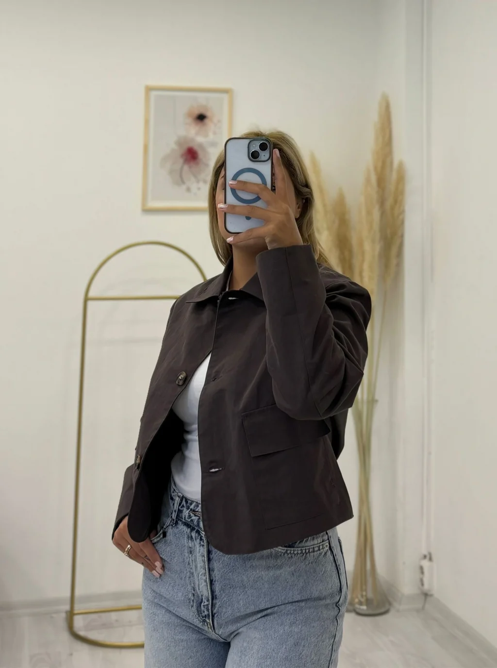 Crop Kesim Klasik Yakalı Büyük Cepli Kanvas Ceket, mevsimlik dış giyimde modern ve minimal bir stil sunar. Tok duruşlu kumaşı ve rahat kalıbıyla günlük kombinlerinize anında şıklık katar.