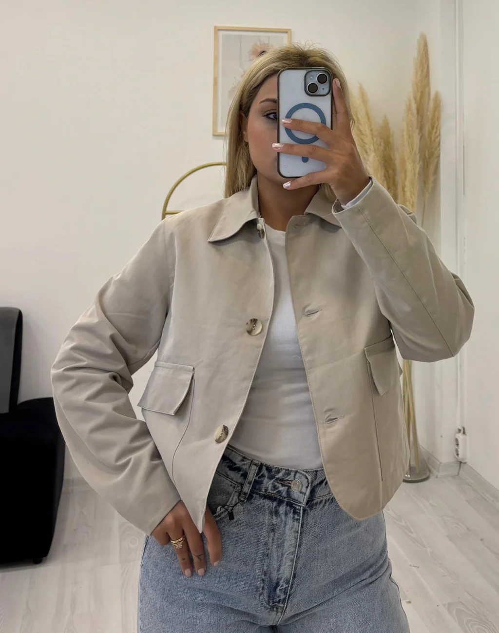 Crop Kesim Klasik Yakalı Büyük Cepli Kanvas Ceket - Bej/Vizon