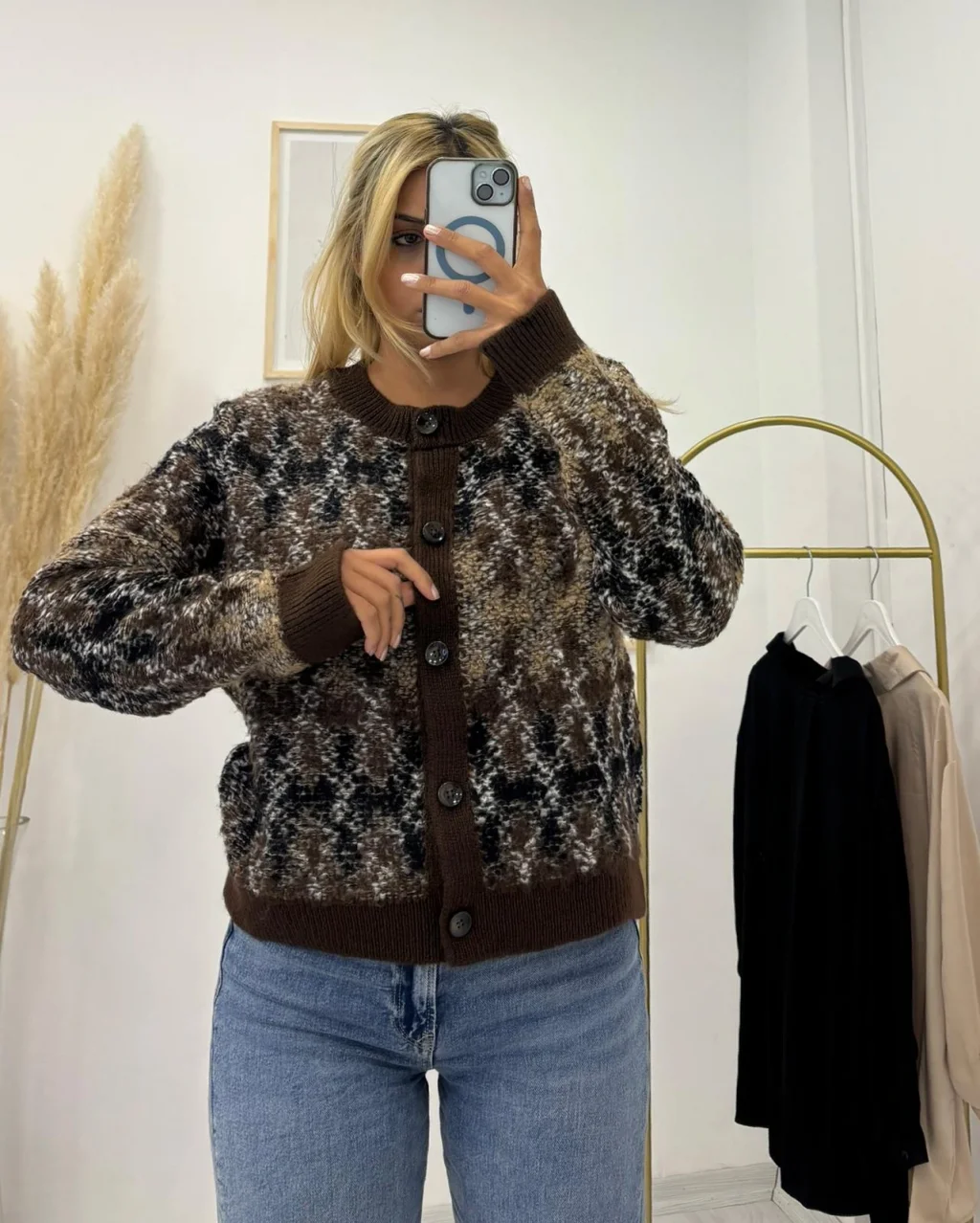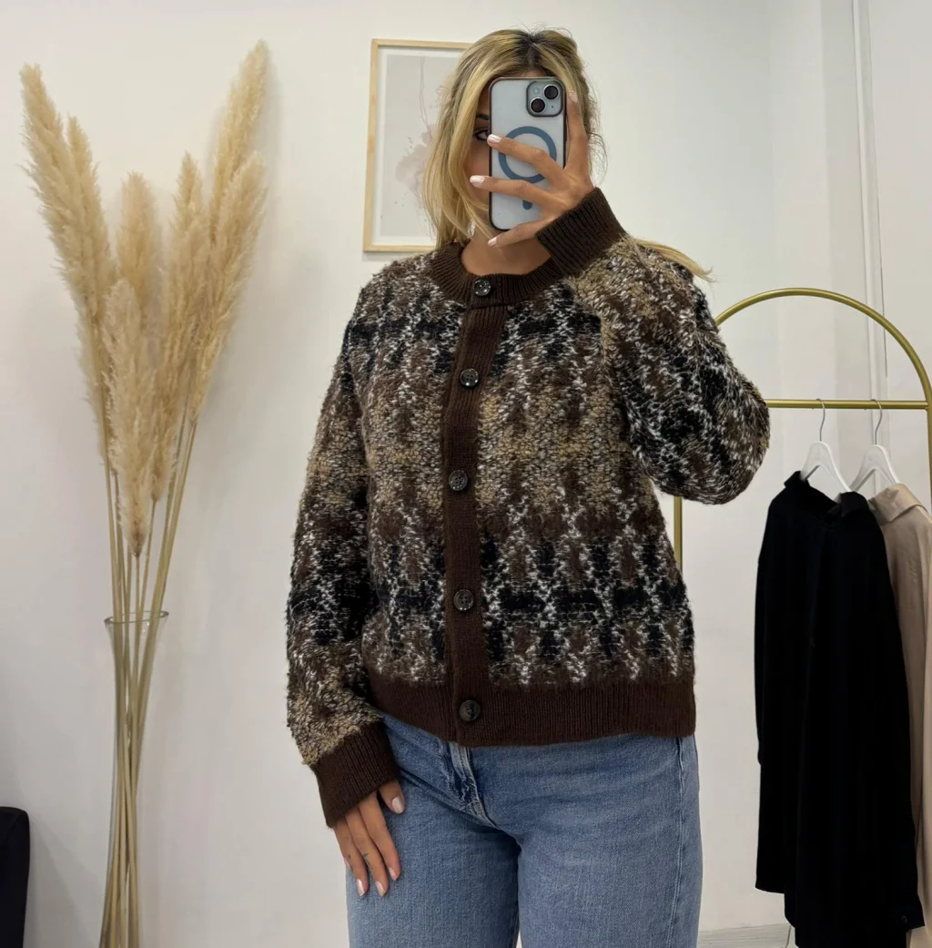 Desenli, Bisiklet Yaka, Pofuduk Düğmeli Hırka - Kahve Tonları, farklı renklerin oluşturduğu deseniyle dikkat çeken, kışlık ve rahat bir parçadır. Kalın dokusuyla soğuk günlerde ekstra sıcaklık sağlar.