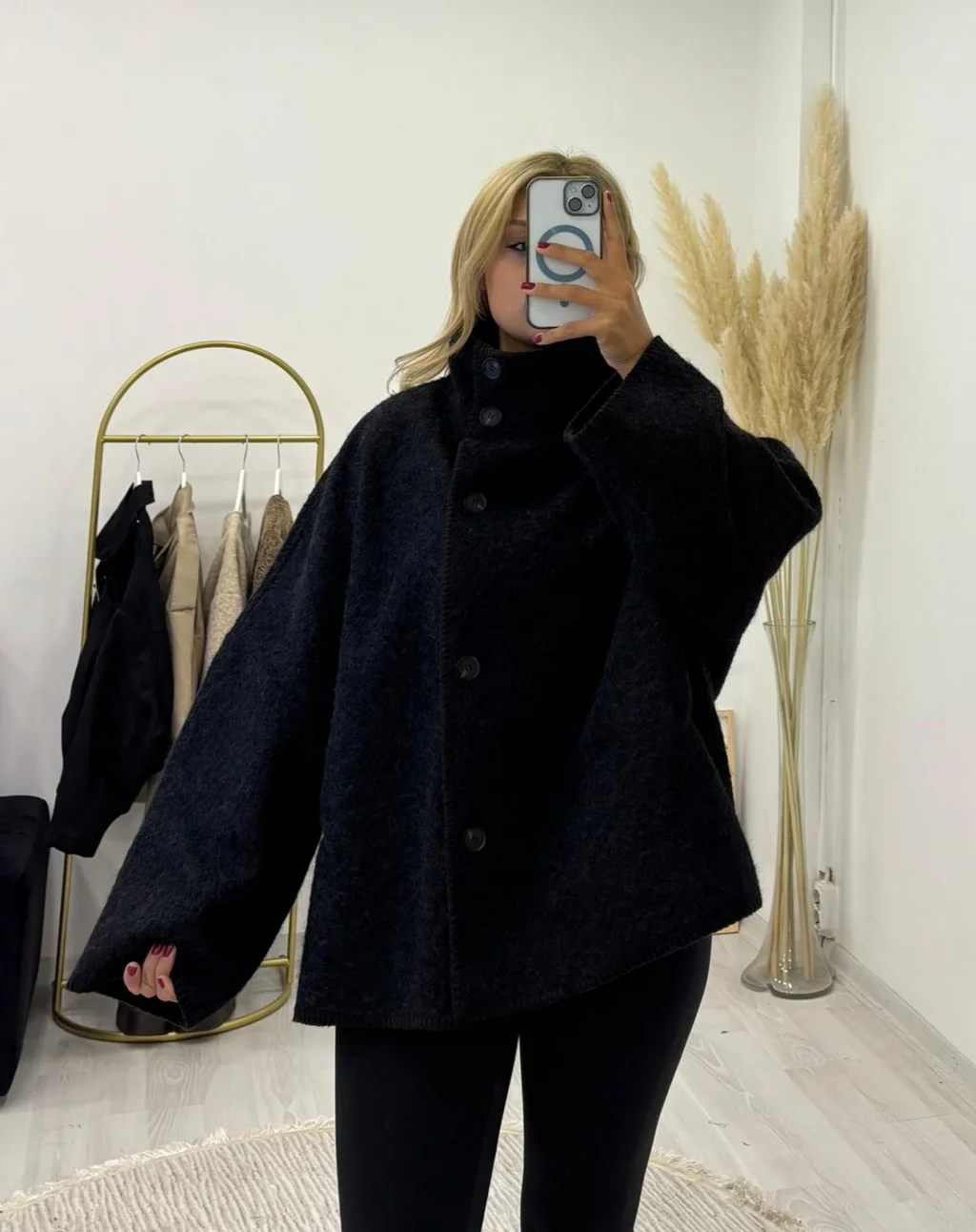 Dik Yaka Düğmeli Oversize Kısa Panço Ceket ile soğuk havalarda stilinizden taviz vermeden sıcak kalın. Panço konforunu ceket şıklığıyla birleştiren bu model, modern ve dökümlü siluetiyle dikkat çeker.