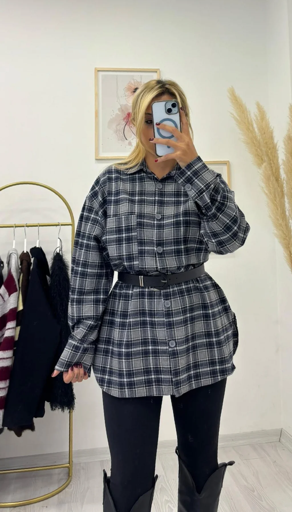 Rahat ve salaş kesimli, uzun kollu, tunik boy ekose gömlek. Siyah, Gri ve Beyaz renklerinin uyumuyla klasik bir kareli desene sahiptir. Görseldeki kemer ürüne dahil değildir ve gömlek sade, dökümlü formuyla satılmaktadır.