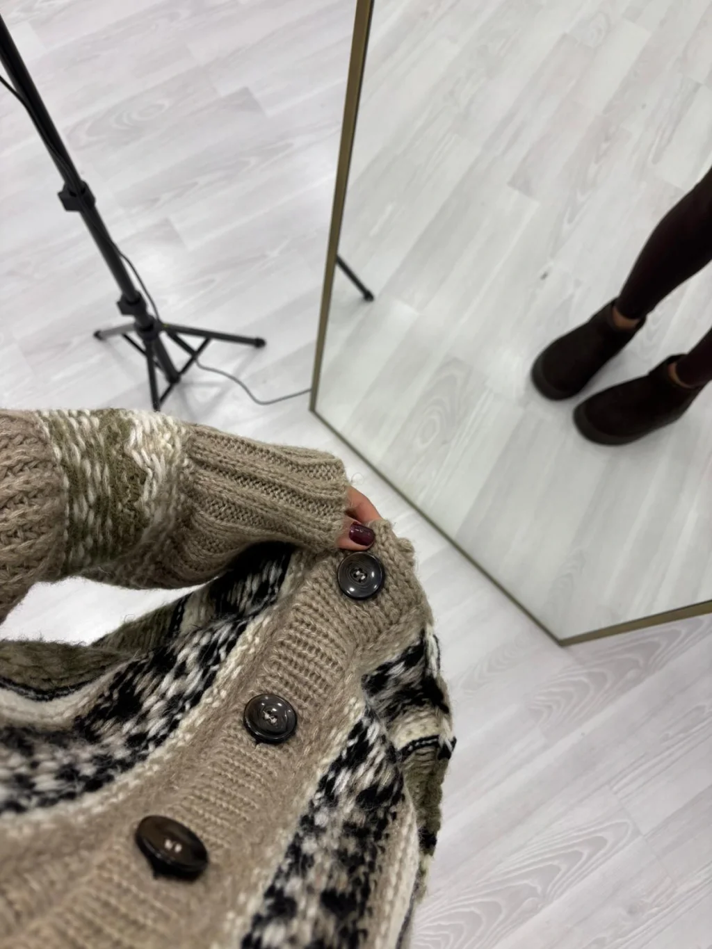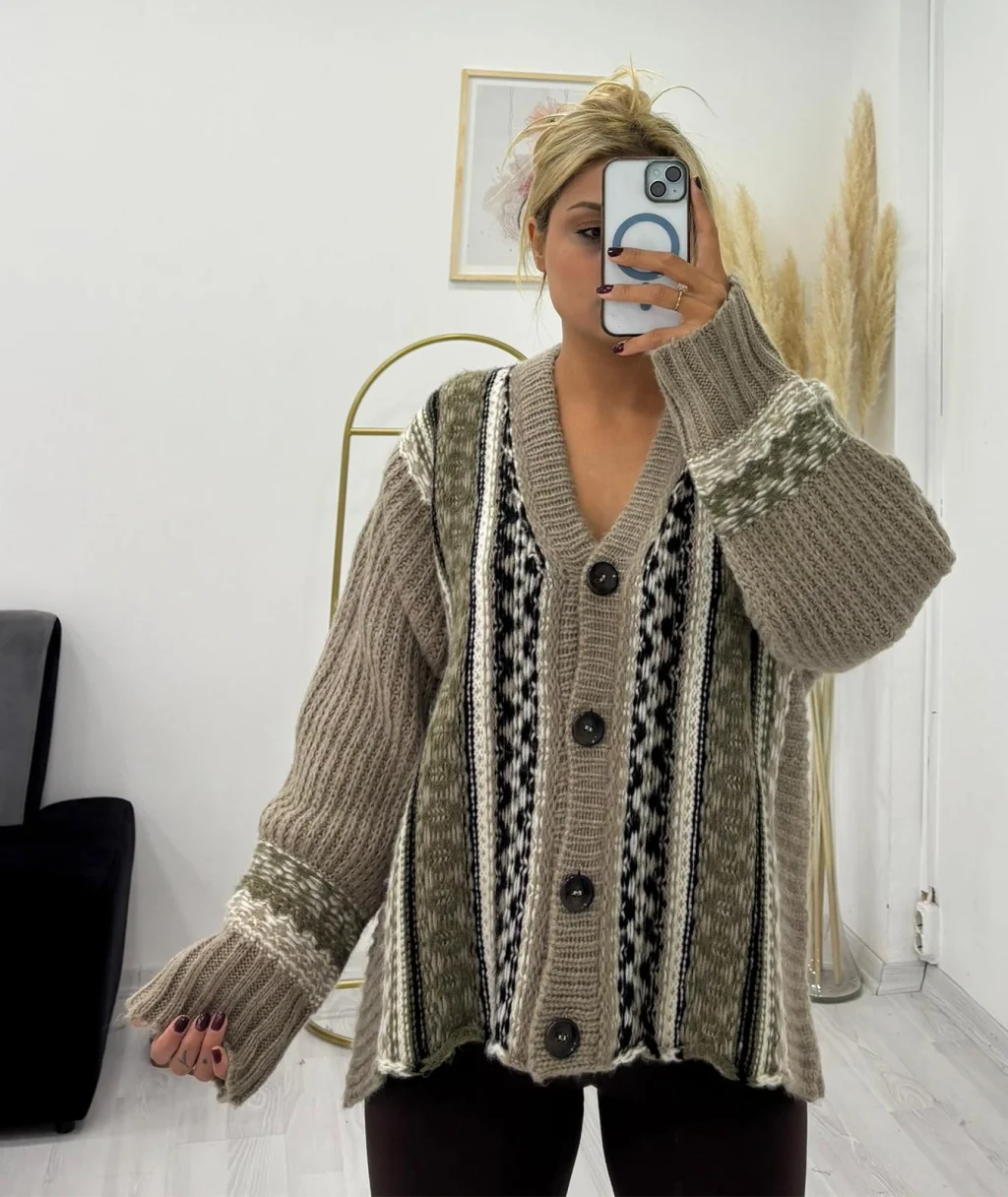 • V yaka, düğmeli ve geniş (balon) kol kesimli etnik/geometrik desenli triko hırka. Canlı renk kombinasyonları ve yumuşak dokusuyla şık bir kış parçasıdır