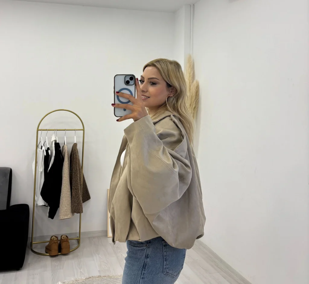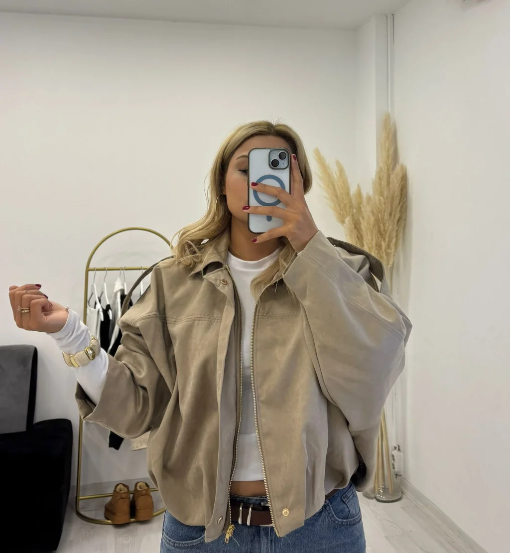 Trend oversize kesimli, fermuarlı ve geniş yakalı kısa bomber ceket. Tok kumaşı ve rahat yapısıyla günlük ve sportif şıklık için ideal. Bej ve siyah renk seçenekleri mevcuttur."