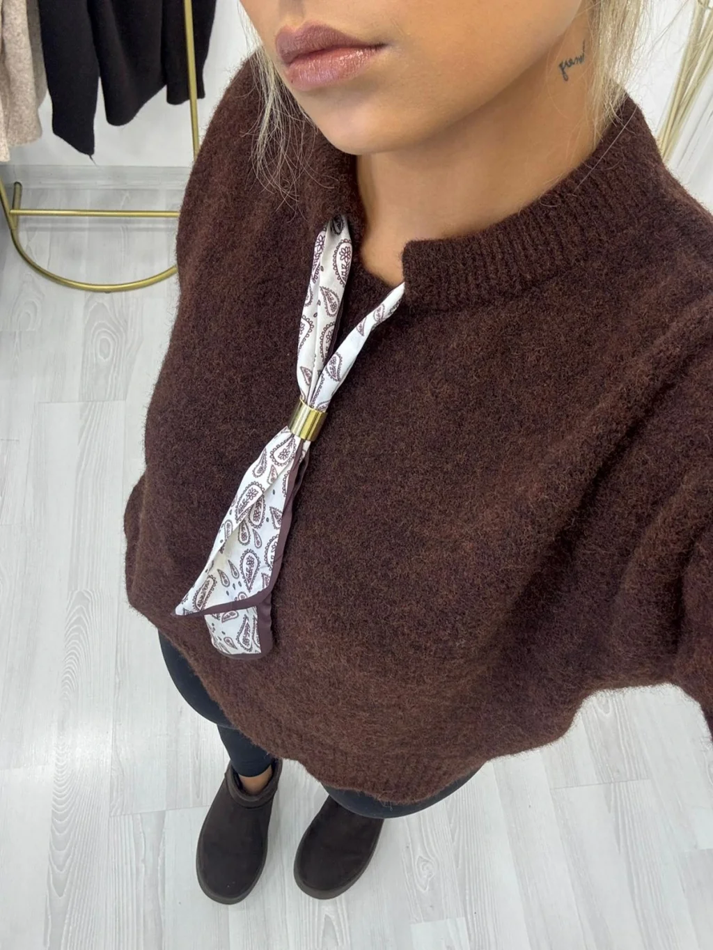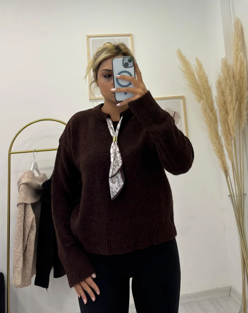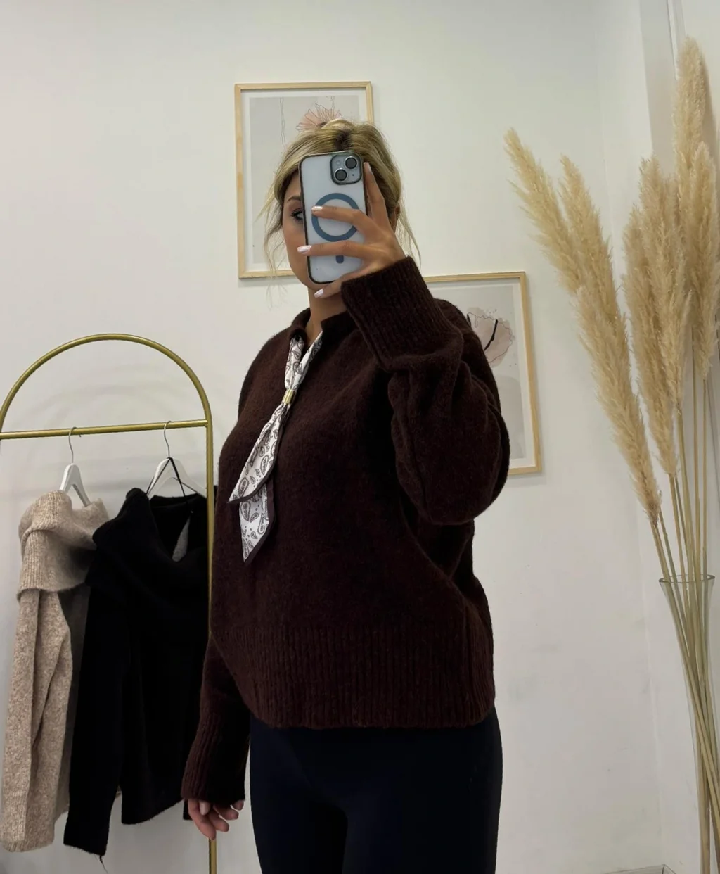 Fularlı Örgü Uzun Kollu Polo Triko - Koyu Kahverengi, yumuşak triko ipliği ve klasik örgü deseninin şık birleşimidir. Koyu, zengin kahverengi tonu, kışlık kombinler için ideal bir temel parça oluşturur.