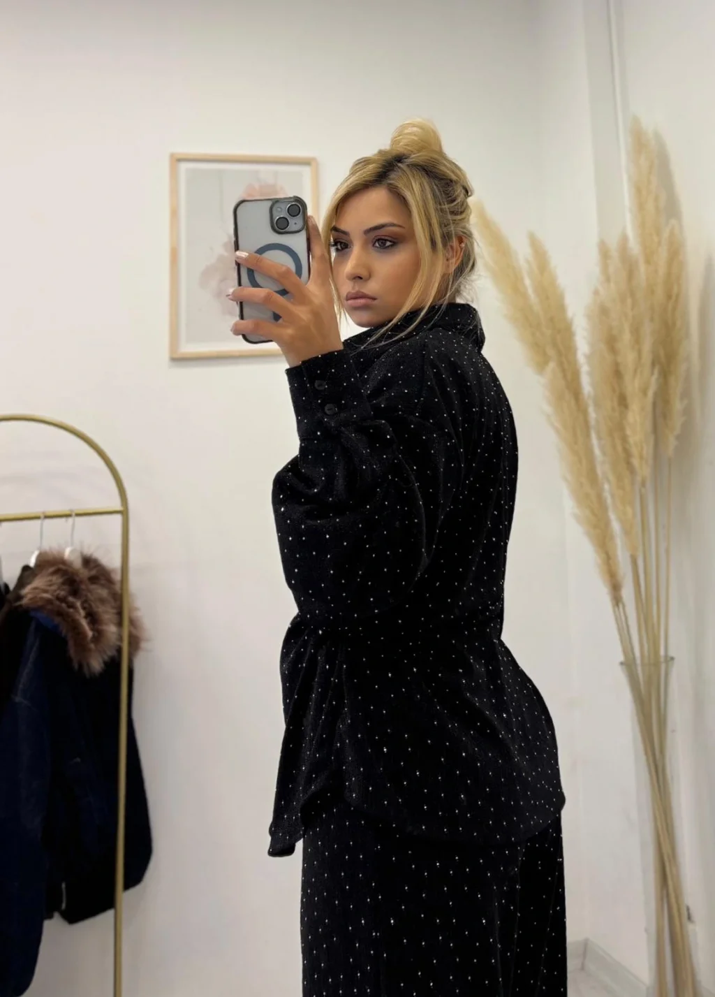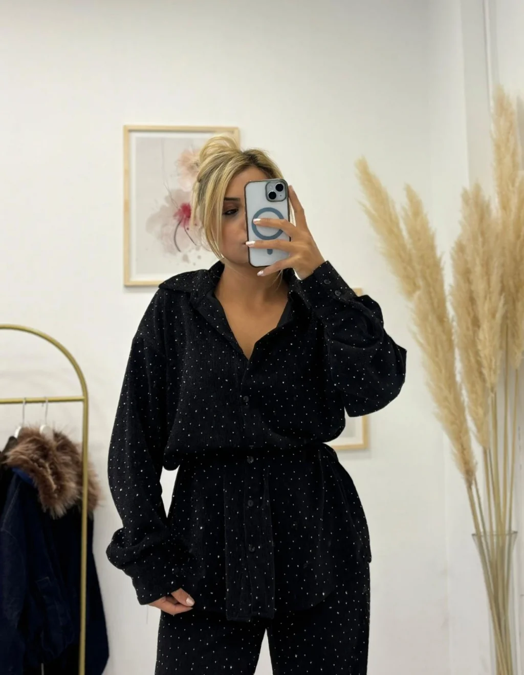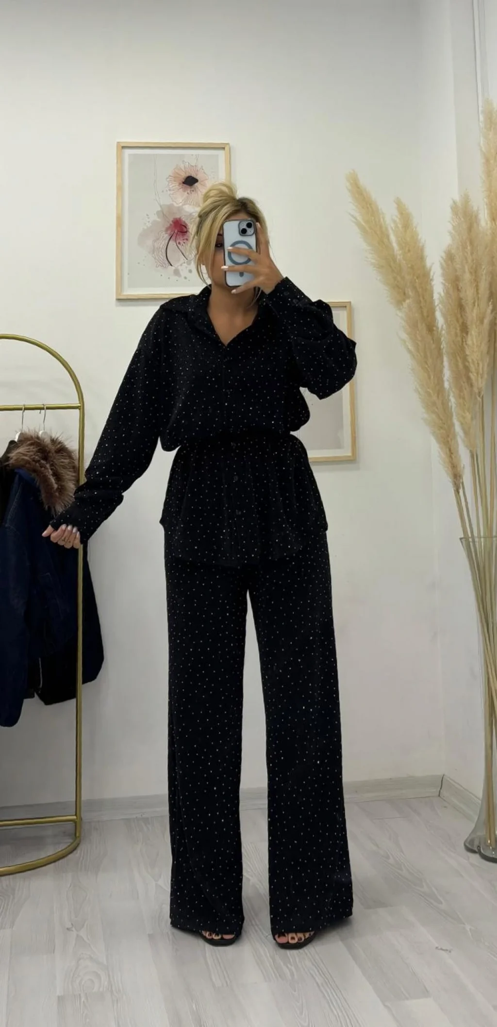 "Özel günler ve davetler için tasarlanmış, baştan sona parlak minik taşlarla (sim/pul görünümlü) işlenmiş iki parçalı takım. Gömlek ve yüksek bel geniş paça pantolon'dan oluşur. Şık ve göz alıcı Siyah rengindedir.