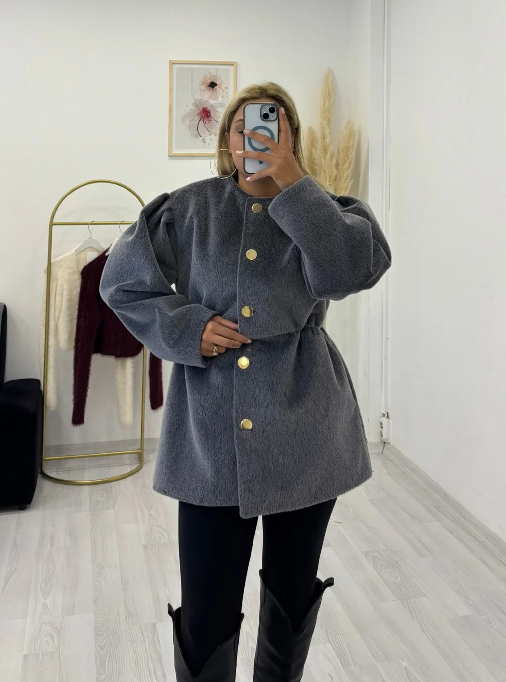 Gold Düğmeli Büzgülü Bel Tüylü Kısa Kaban - Füme/Siyah
