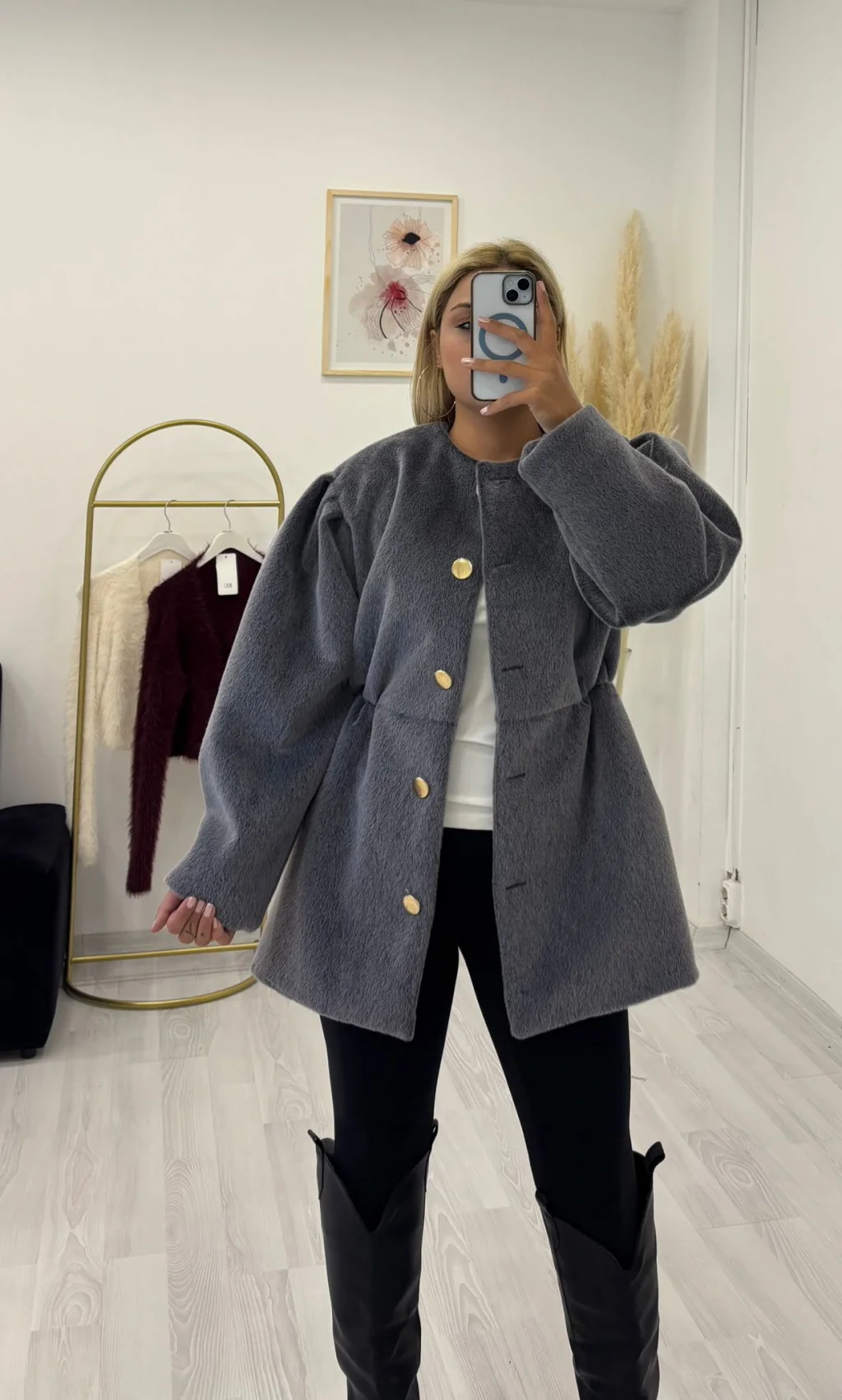 • Yumuşak tüylü (shaggy) dokuya sahip, gold düğmeli ve yuvarlak yaka kısa kaban/ceket. Belindeki büzgü (lastik/ribana) detayı ile fit bir görünüm sağlar. Füme ve siyah renk seçenekleri mevcuttur.