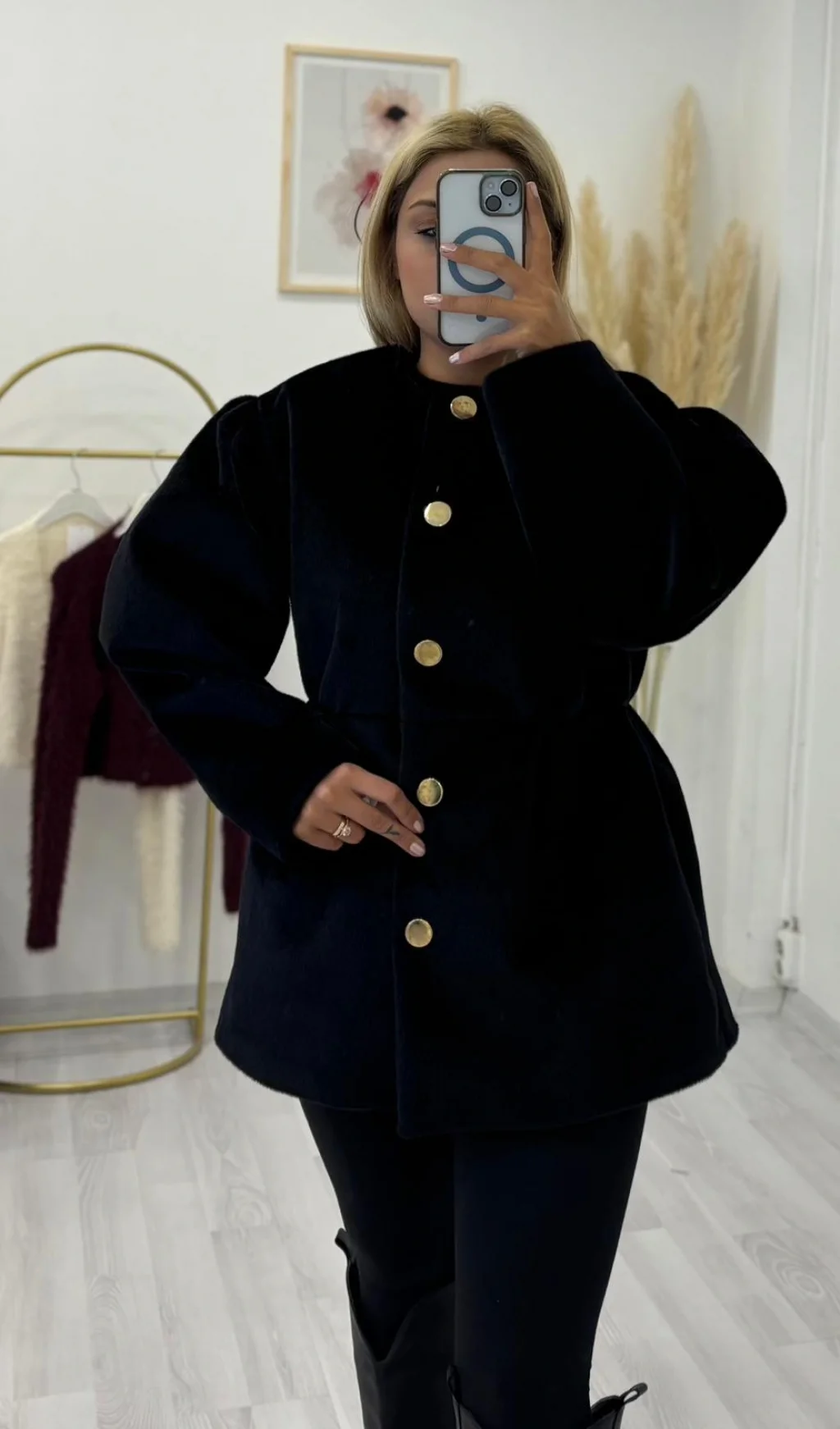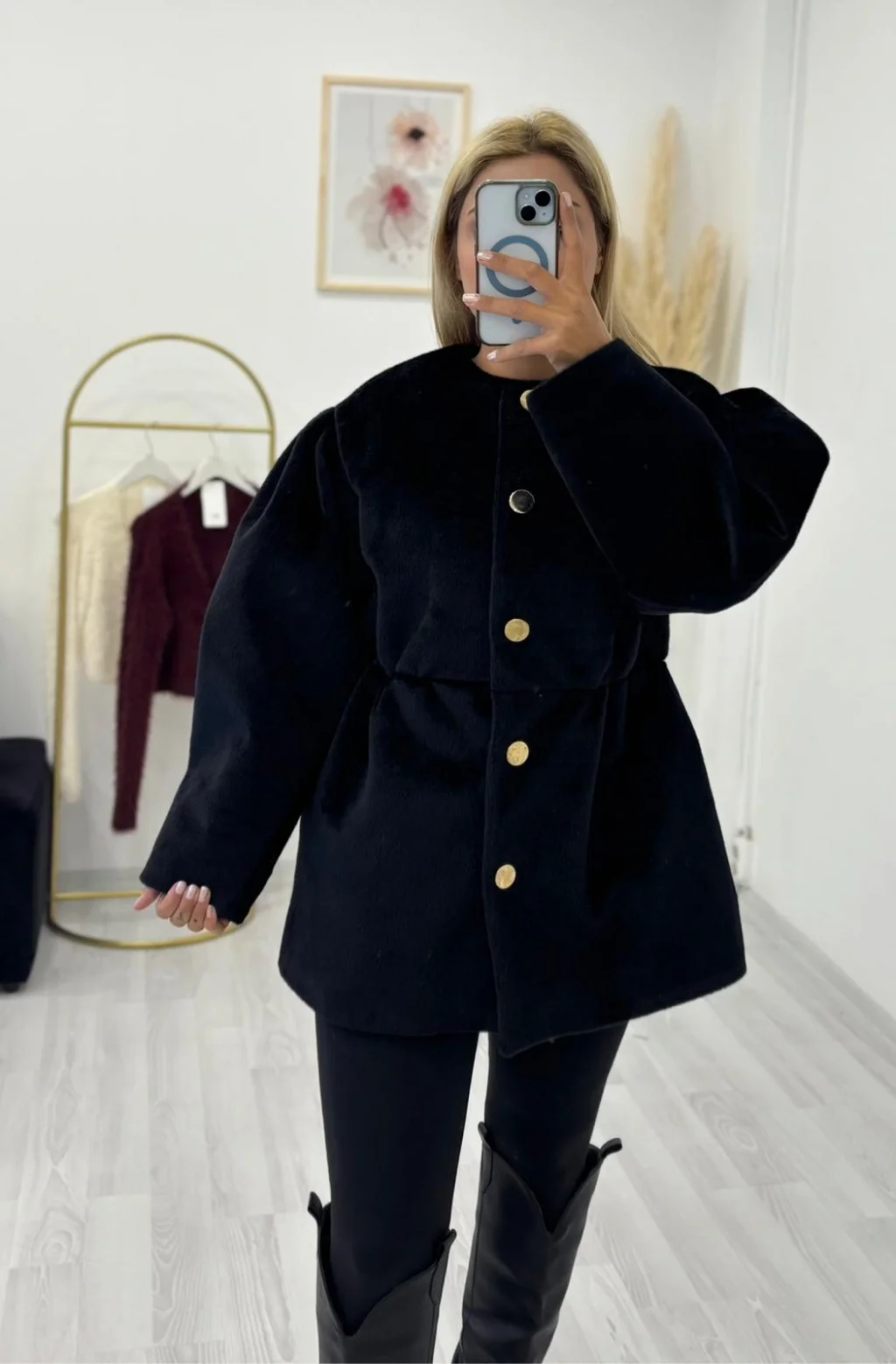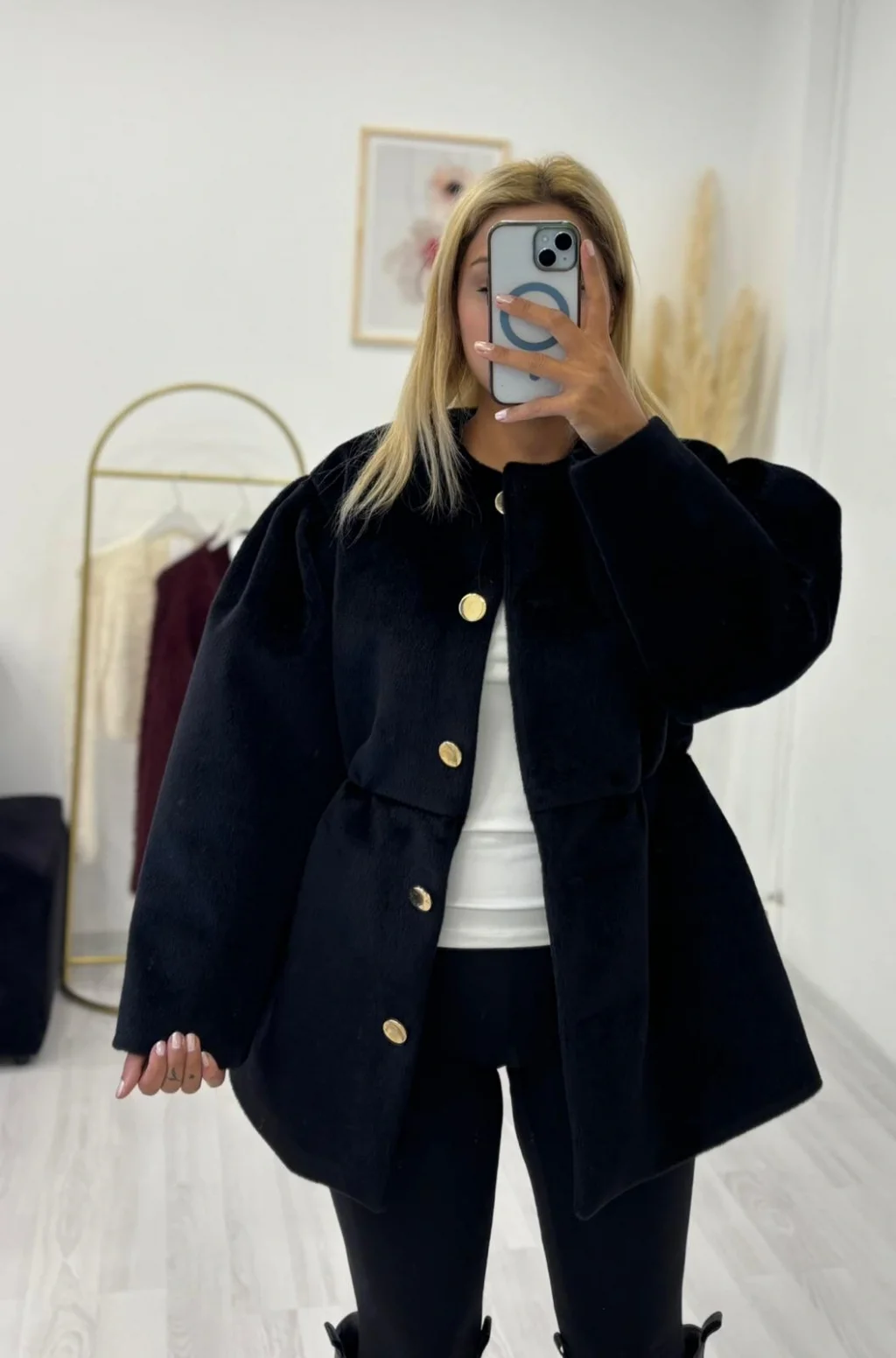 "Gold Düğmeli Büzgülü Bel Tüylü Kısa Kaban, kış aylarında sıcaklık ve modern şıklığı bir araya getiriyor. Benzersiz dokusu ve sportif bel detayı sayesinde casual ve şık kombinlerinizin tamamlayıcısı olacak.