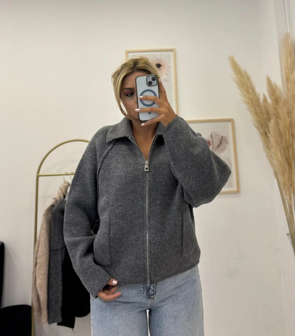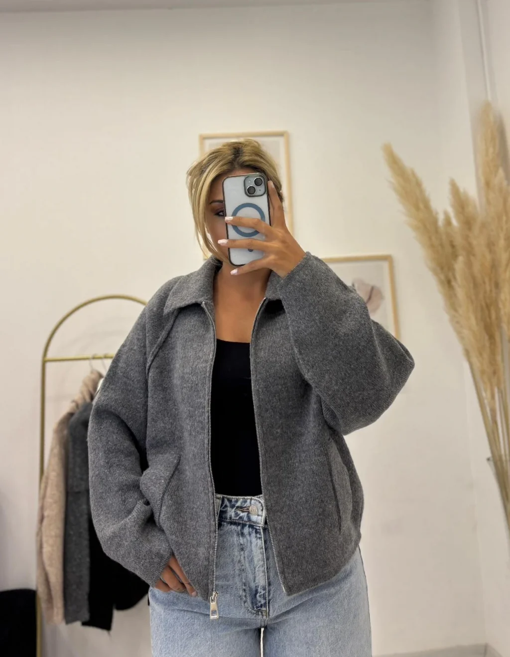 Kalın ve yumuşak triko ipliğiyle örülmüş, şık Koyu Gri (Antrasit) tonlarında triko ceket. Oversize (bol) kesimli, gömlek yakalı ve önü metal fermuar ile kapanır. Ceket veya dış giyim alternatifi olarak idealdir.