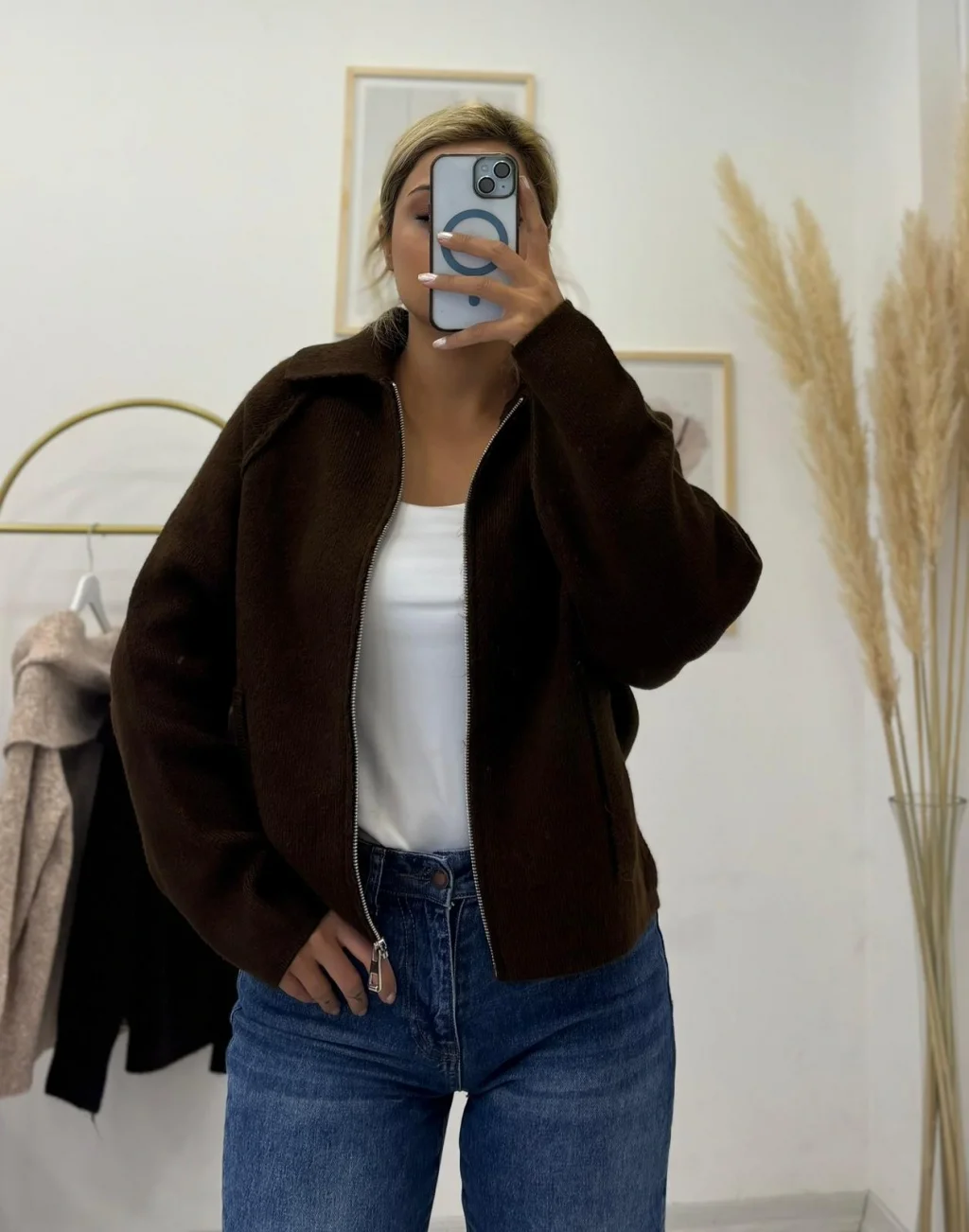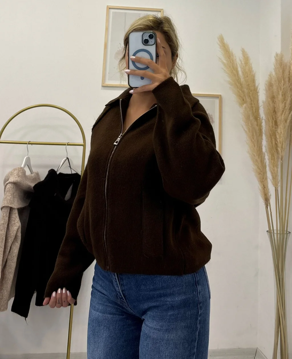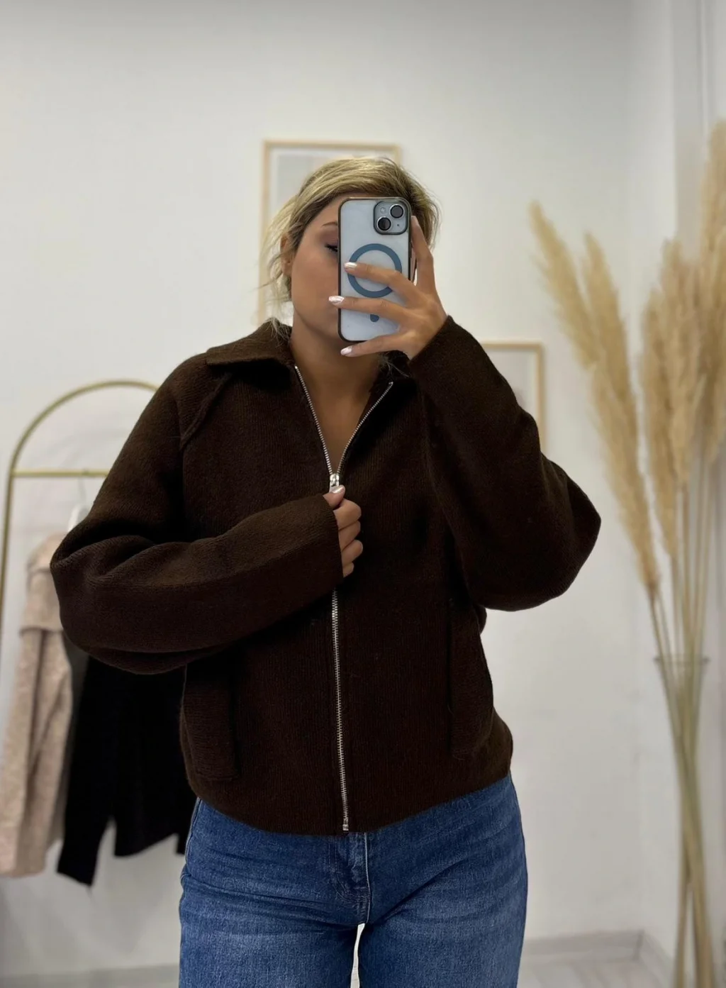 Kalın ve yumuşak triko ipliğiyle örülmüş, zengin Koyu Kahverengi tonlarında triko ceket. Oversize (bol) kesimli, gömlek yakalı ve önü metal fermuar ile kapanır. Ceket veya dış giyim alternatifi olarak idealdir.