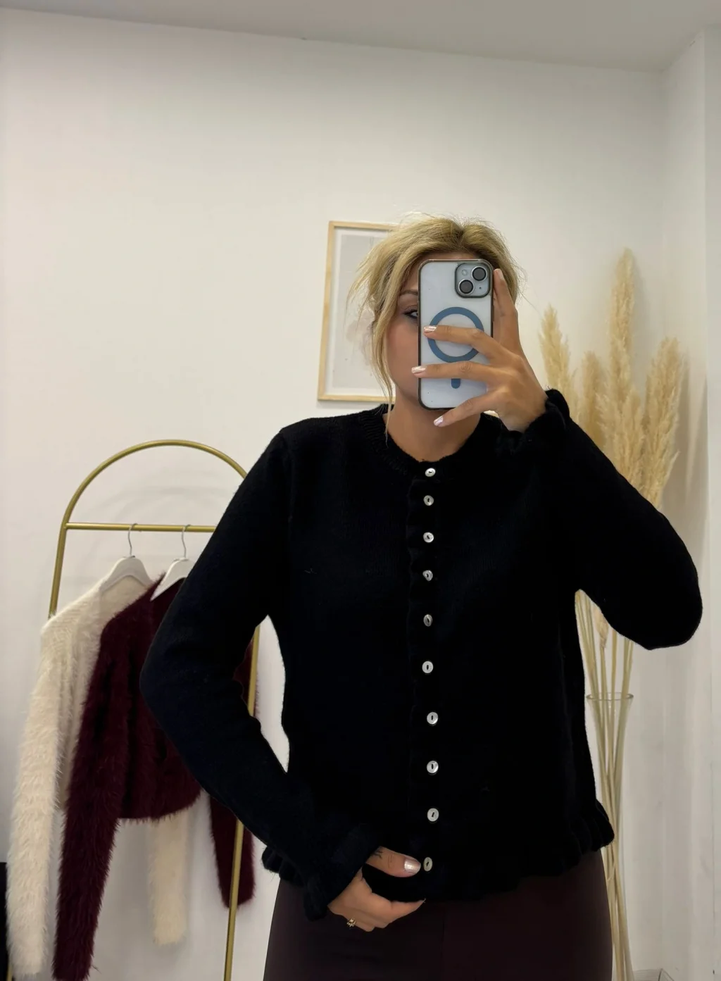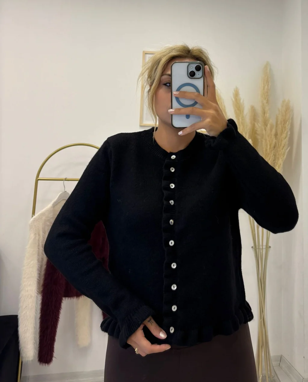 Etek ucundaki hacimli fırfır (ruffle) detayı, hırkaya hafif bir peplum havası katarak bel bölgesini ince gösterir.