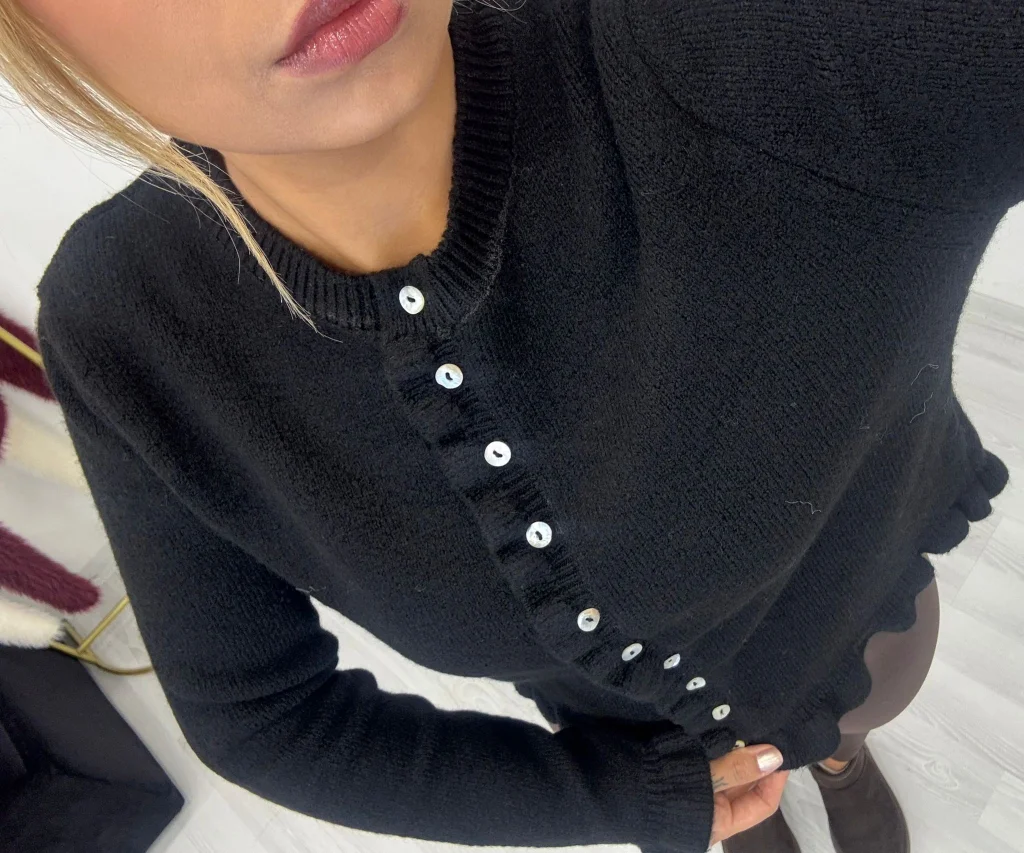 Etek ve Manşet Ucu Fırfır Detaylı Triko Hırka, klasik triko şıklığını feminen ve romantik dokunuşlarla birleştiriyor. Hafif ve yumuşak yapısıyla bahar ve kış aylarında bluz ya da katman olarak rahatlıkla kullanılabilir.