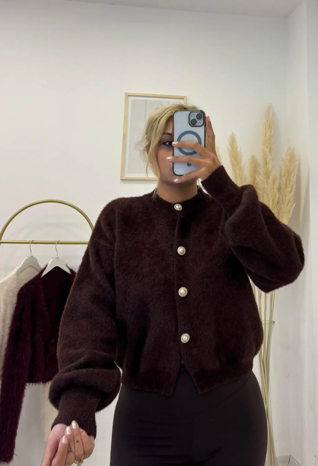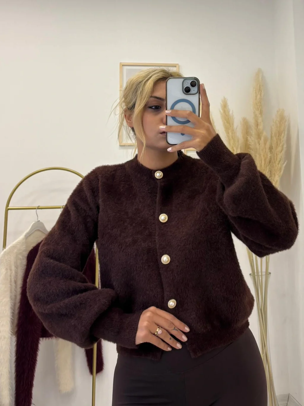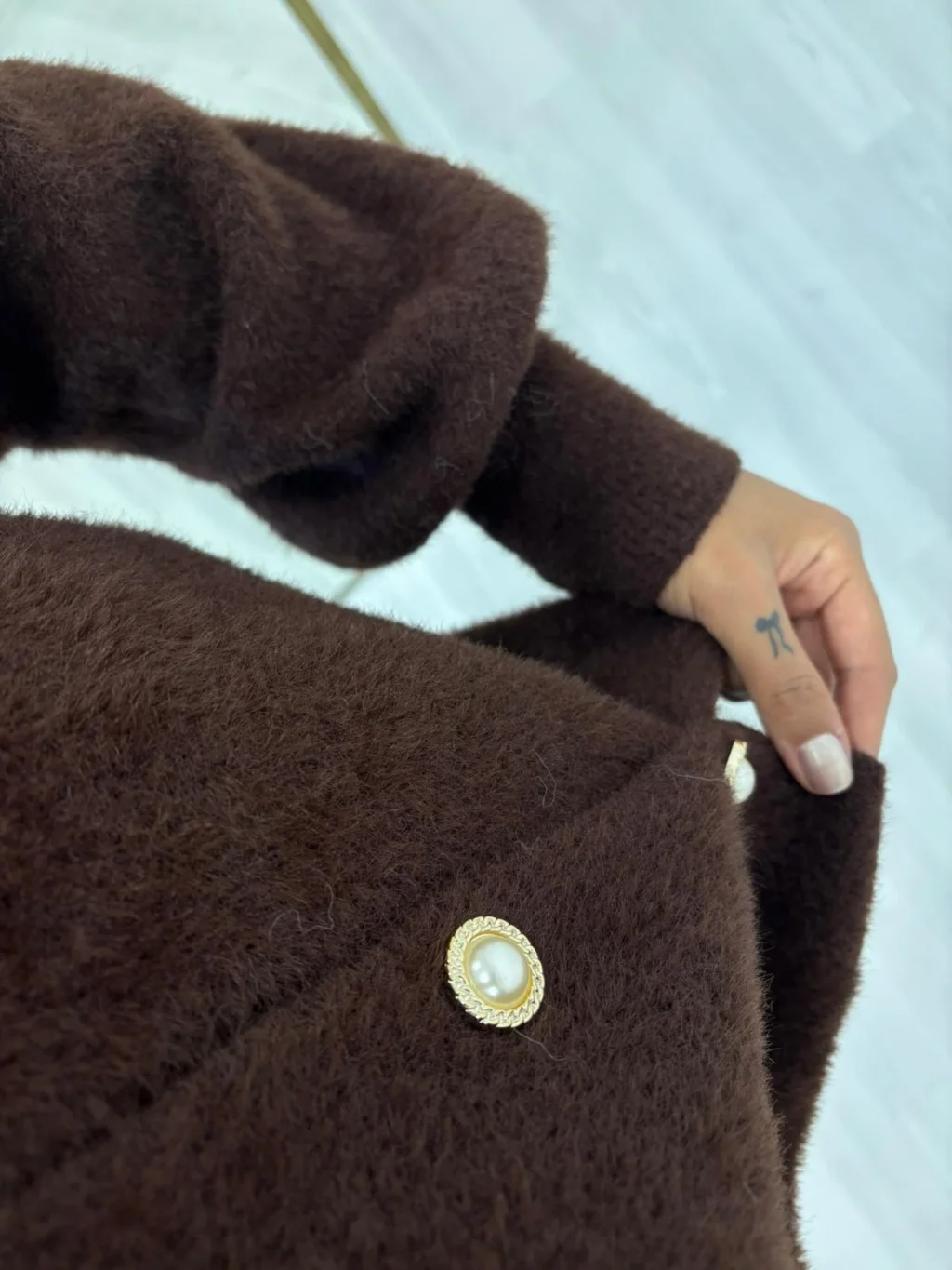İnci Düğmeli Balon Kollu Yumuşak Tüylü (Fuzzy) Triko Hırka - Koyu Kahve