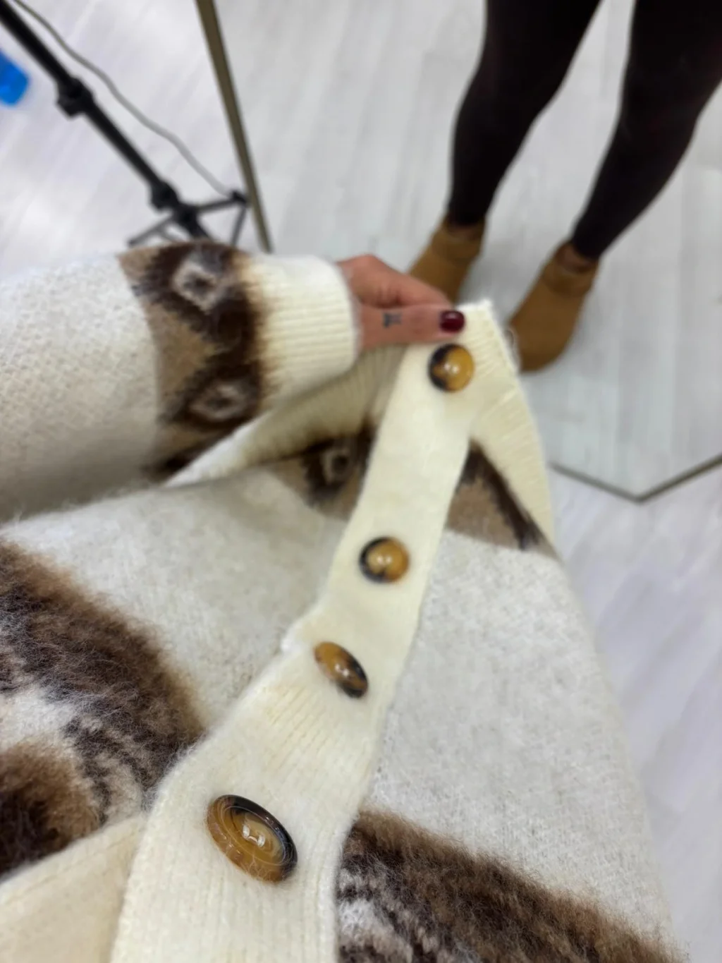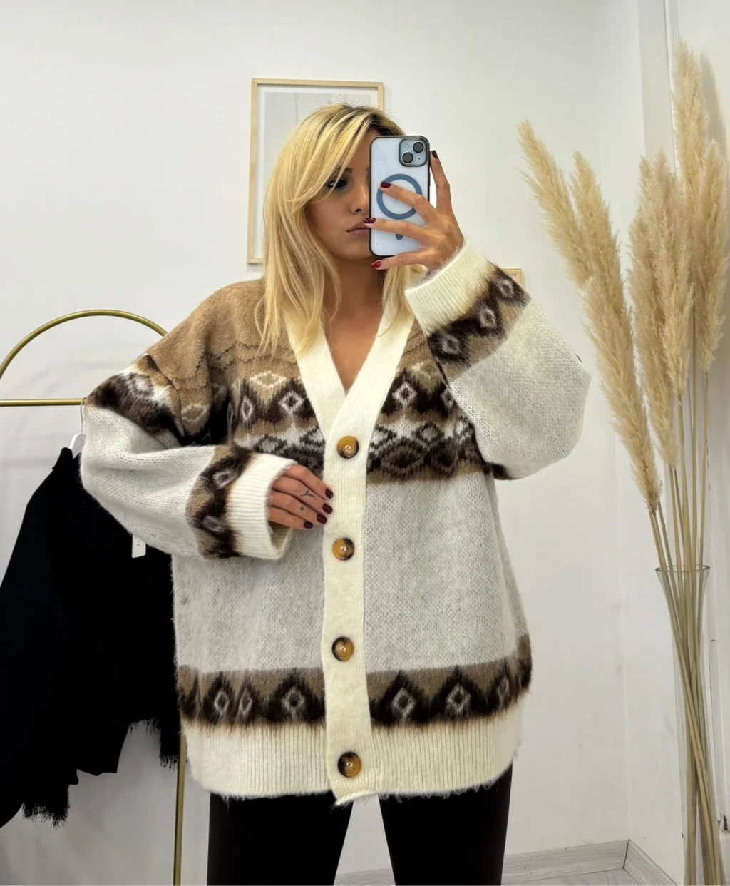 Yumuşak, sıcak tutan ve pofuduk dokuya sahip, oversize kesimli triko hırka. V yaka, önü büyük düğmeli ve kış temalı jakar (etnik/desenli) desene sahiptir. Rengi sıcak Kahve, Bej ve Krem tonlarından oluşur.