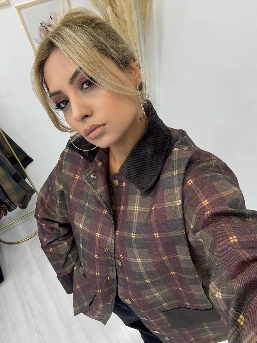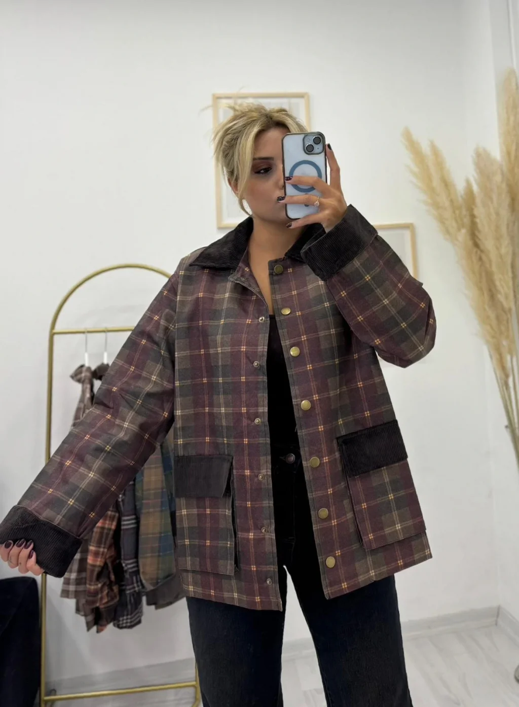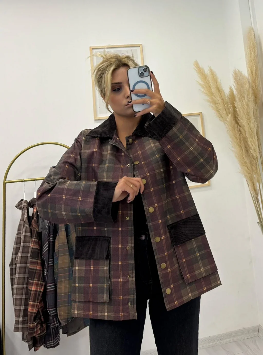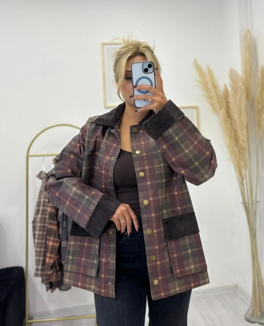 • Malzeme ve Doku: Ana gövde, tok ve kalın, yün veya pamuk karışımlı kareli/ekose desenli bir kumaştan yapılmıştır. Yaka, manşet ve cep detaylarında yumuşak dokulu fitilli kadife (corduroy) kullanılarak dikkat çekici bir doku kontrastı yaratılmıştır.