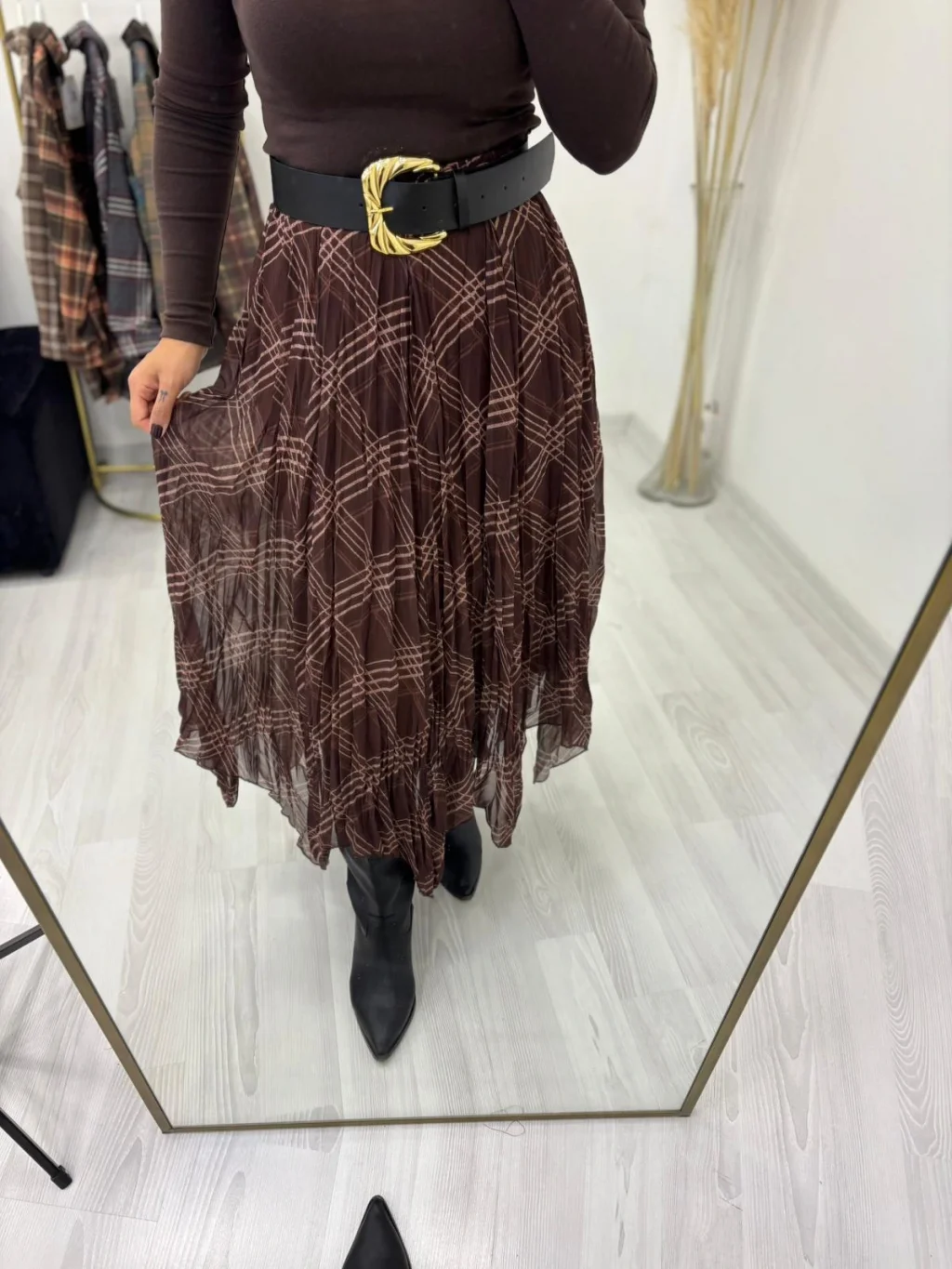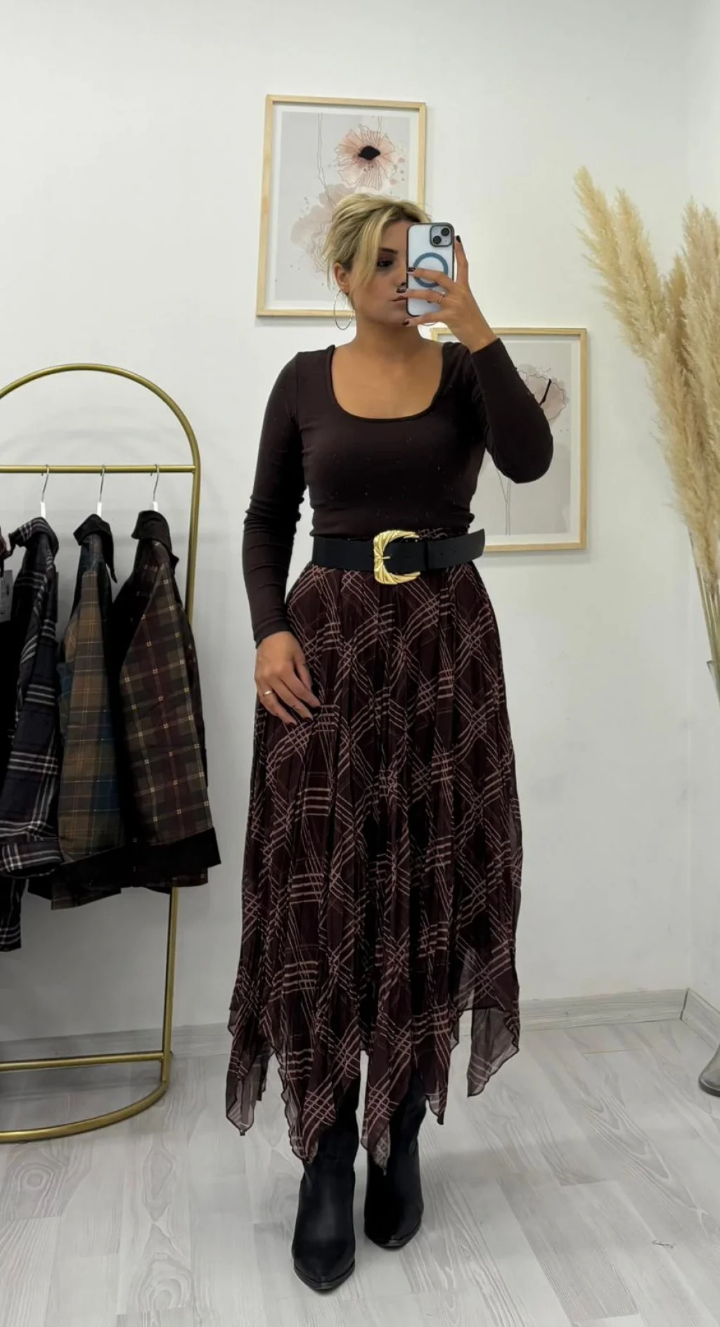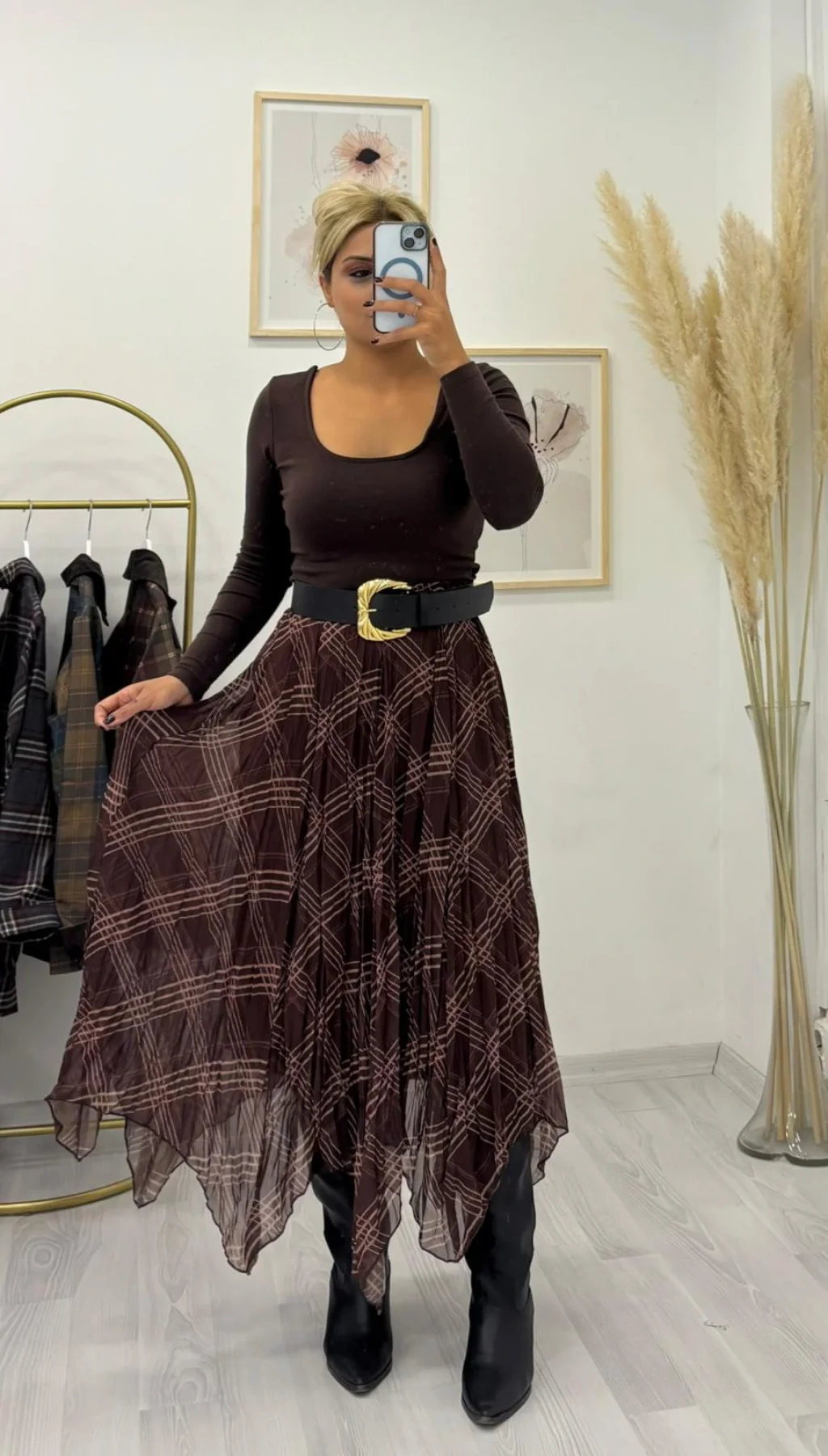 Kahverengi Ekose Desenli Pileli Midi Etek, sonbahar/kış sezonunun vazgeçilmezi olan ekose desenini, dinamik pile dokusuyla birleştirir. Akışkan ve dökümlü yapısıyla zarif bir hareket sağlar ve hem günlük hem de şık ortamlara kolayca uyum sağlar.
