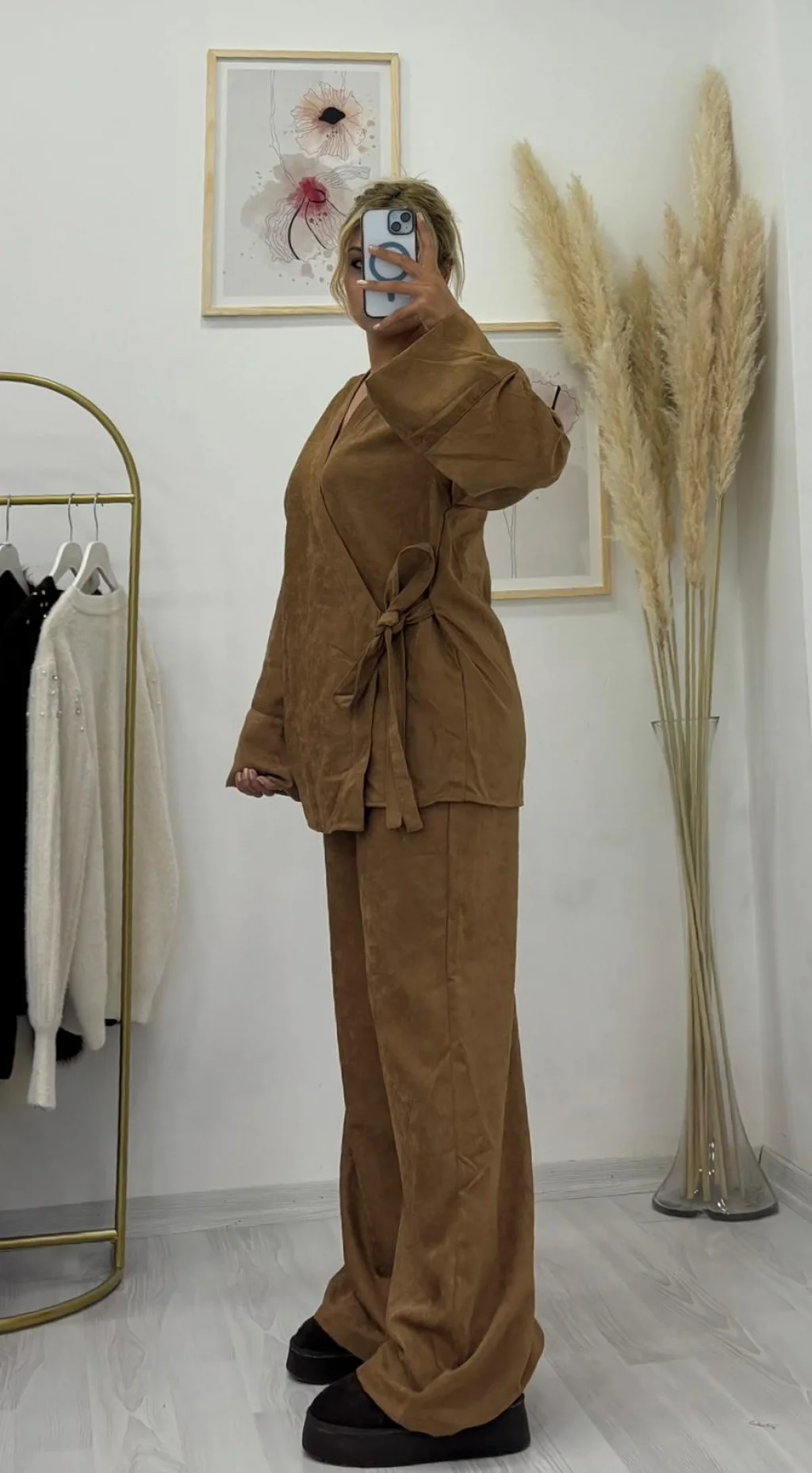 Kahverengi Kruvaze Kimono Üst ve Bol Paça Pantolon Takımı, minimal ve rahat stili, trend Kahverengi tonuyla birleştirir. Hafif mat, tok ve dökümlü kumaşı sayesinde gün boyu konfor ve sofistike bir duruş sunar.