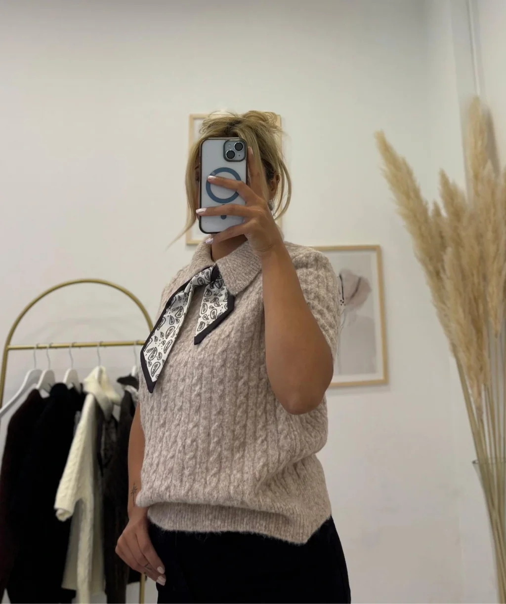Kısa Kollu Fularlı Örgü Desenli Polo Yaka Triko - Bej