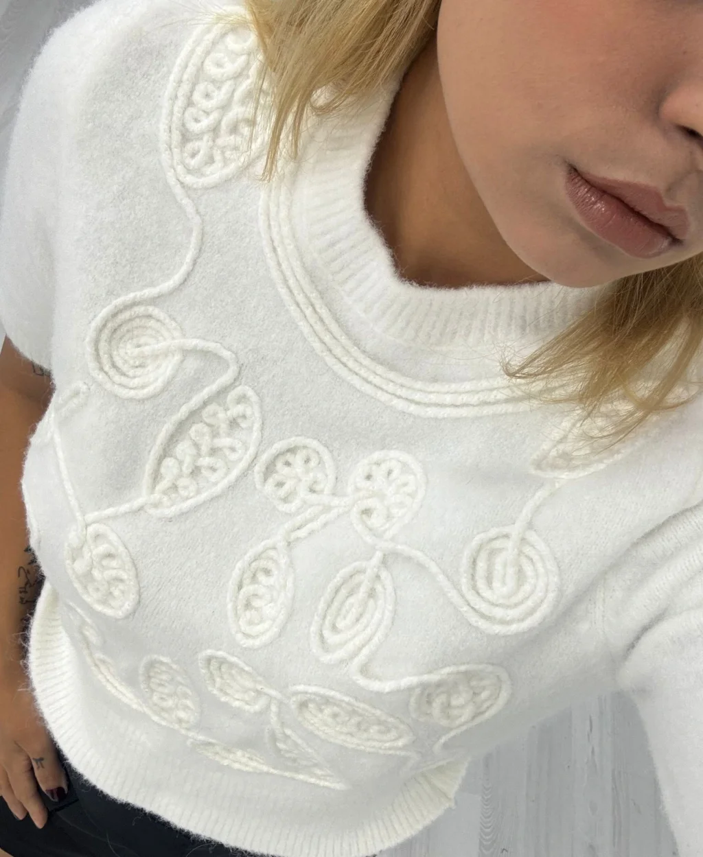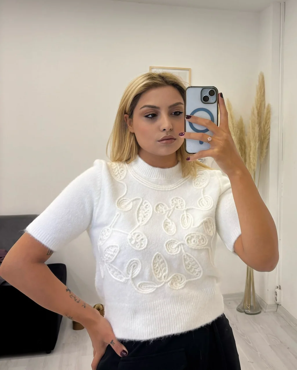 Yumuşak dokulu, kısa kollu beyaz triko kazak. Ön yüzeyinde kabartmalı beyaz yaprak (veya dal) desenli nakış detayları bulunur. Geçiş mevsimleri için şık bir parça