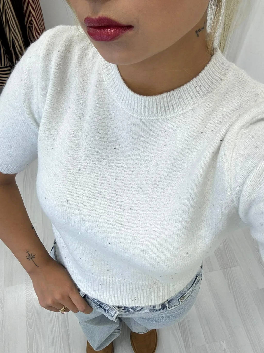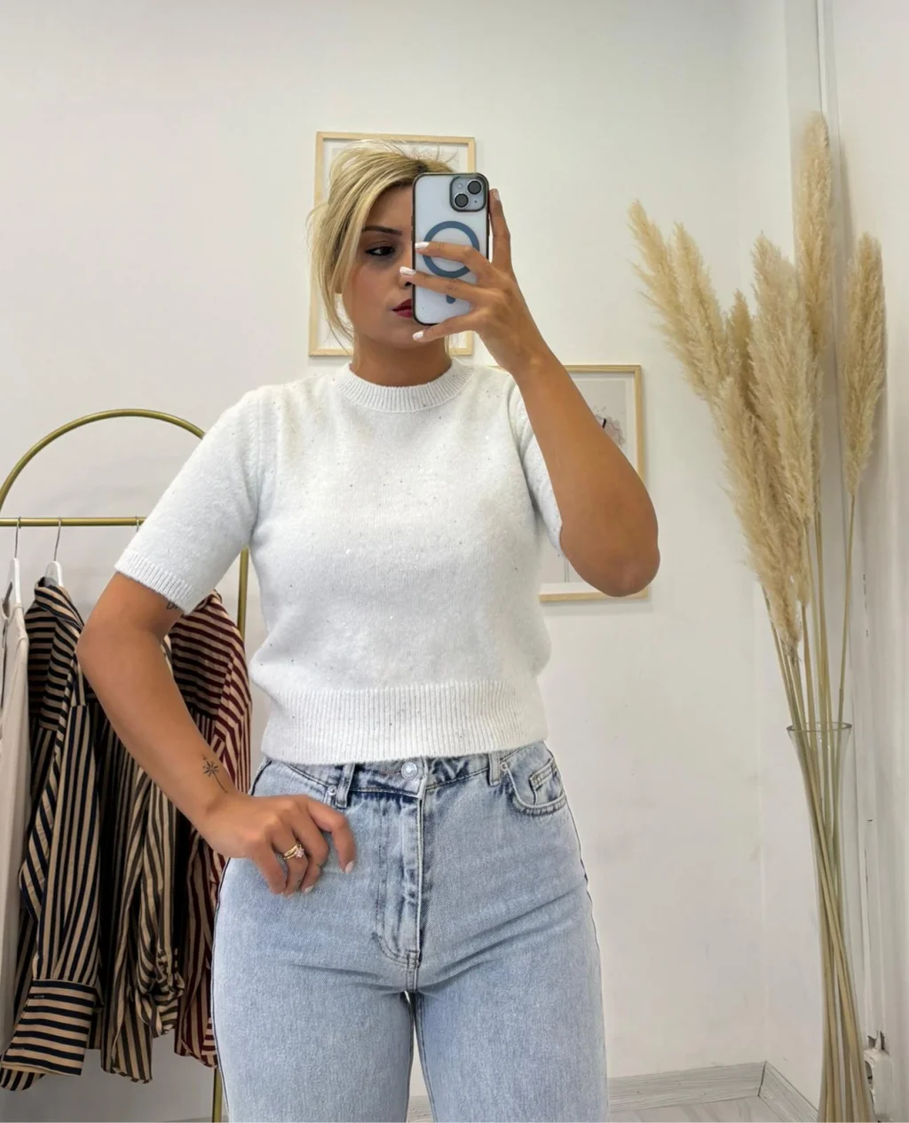 Kısa Kollu Yumuşak Dokulu Sim/Pul Detaylı Triko Üst - Ekru/Krem, trikonun konforunu ve lüks bir dokunuşu birleştirir. Soğuk havalarda ceket içine giymek veya şık davetlerde tek başına kullanmak için ideal bir parçadır.
