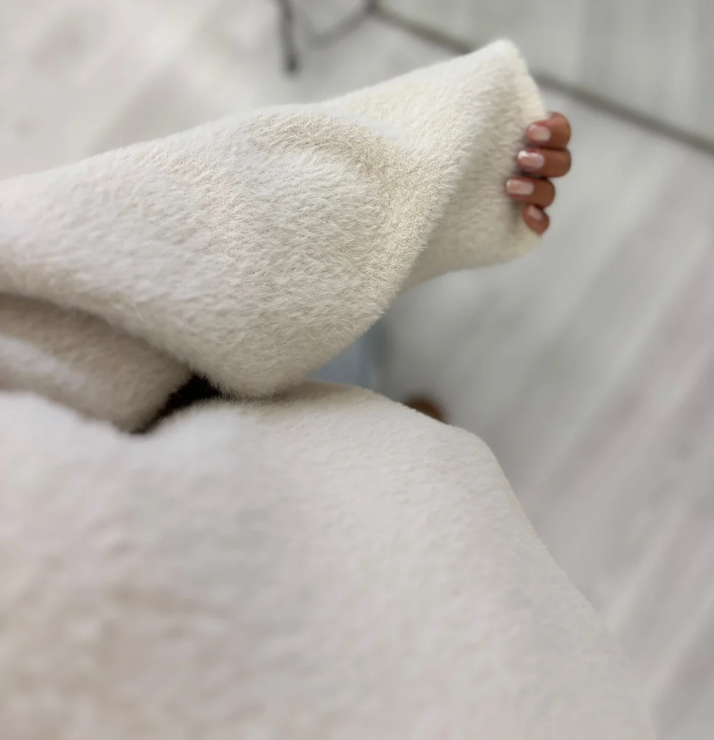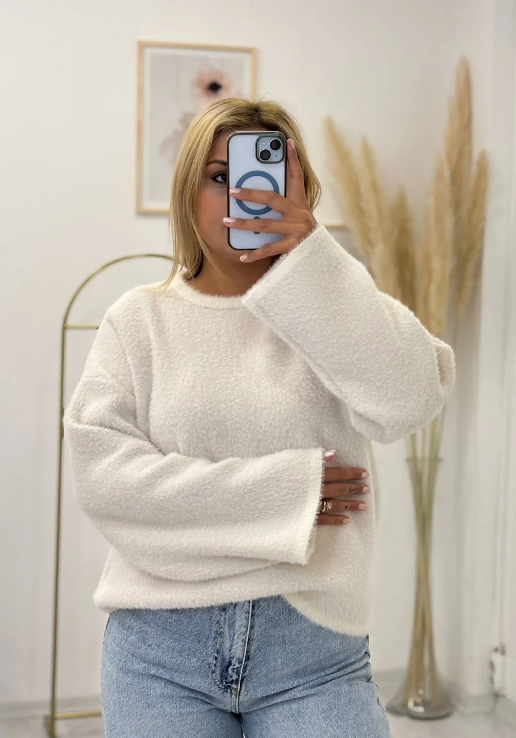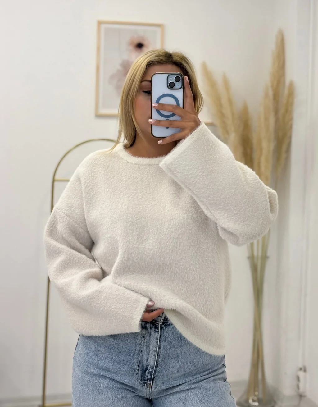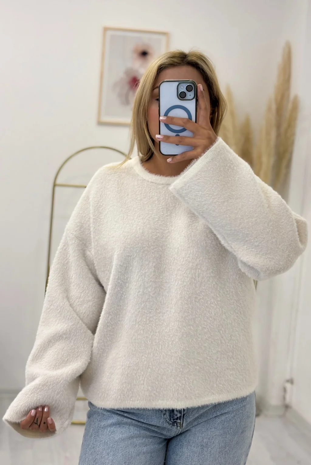 Yumuşacık, tüylü (shaggy) dokuya sahip, bisiklet yaka, oversize triko kazak. Rahat kesimi ve krem rengiyle sonbahar-kış basic kombinlerinizin vazgeçilmezi.