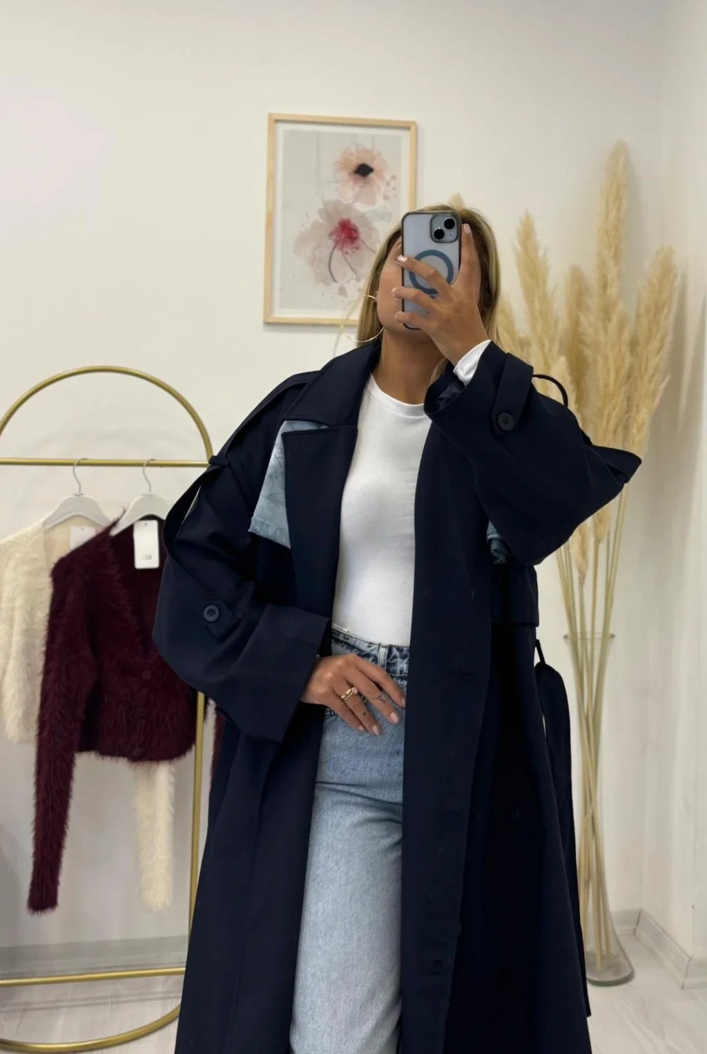 • Geniş rever yakası klasik trençkot stilini vurgular.