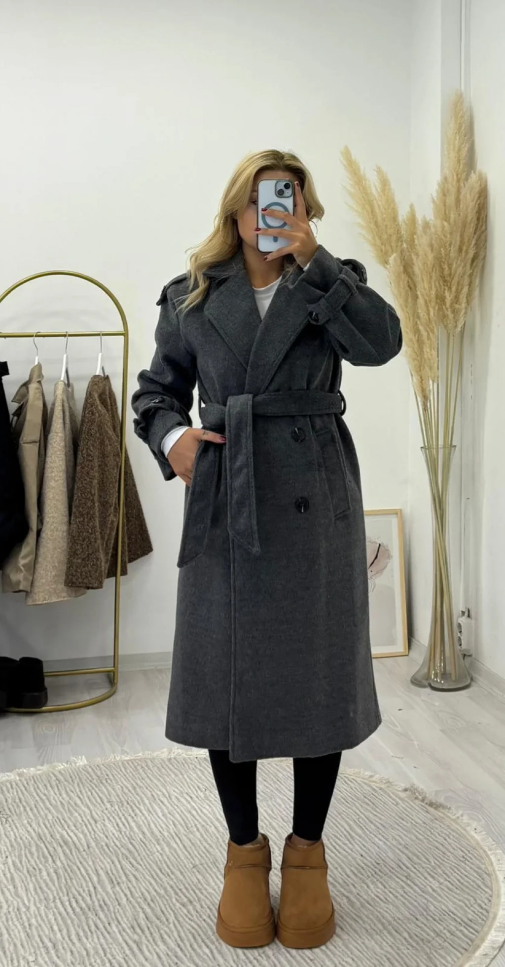 • Detaylar: Paltonun ön kısmında bulunan çift sıra büyük düğmeler (genellikle ikişerli, dört düğme) dikkat çeker. Bel kısmındaki kendi kumaşından kalın bağlama kuşağı, paltonu açık veya kapalı kullanmanıza, aynı zamanda bele vurgu yapmanıza olanak tanır.