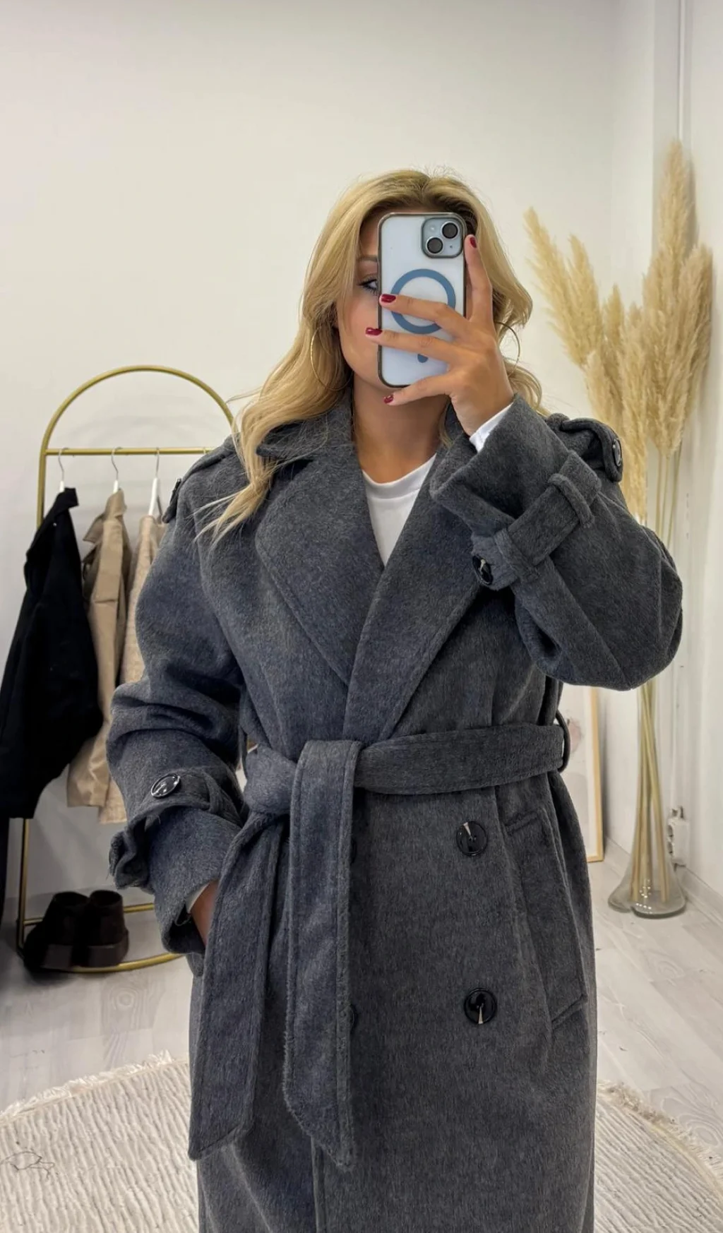 • Kruvaze yaka, çift düğmeli, kuşaklı ve uzun kesim kaşe palto. Kış aylarının vazgeçilmezi bu model, omuz ve kol detaylarıyla şıklığınızı tamamlar. Açık ve koyu gri tonları mevcuttur.