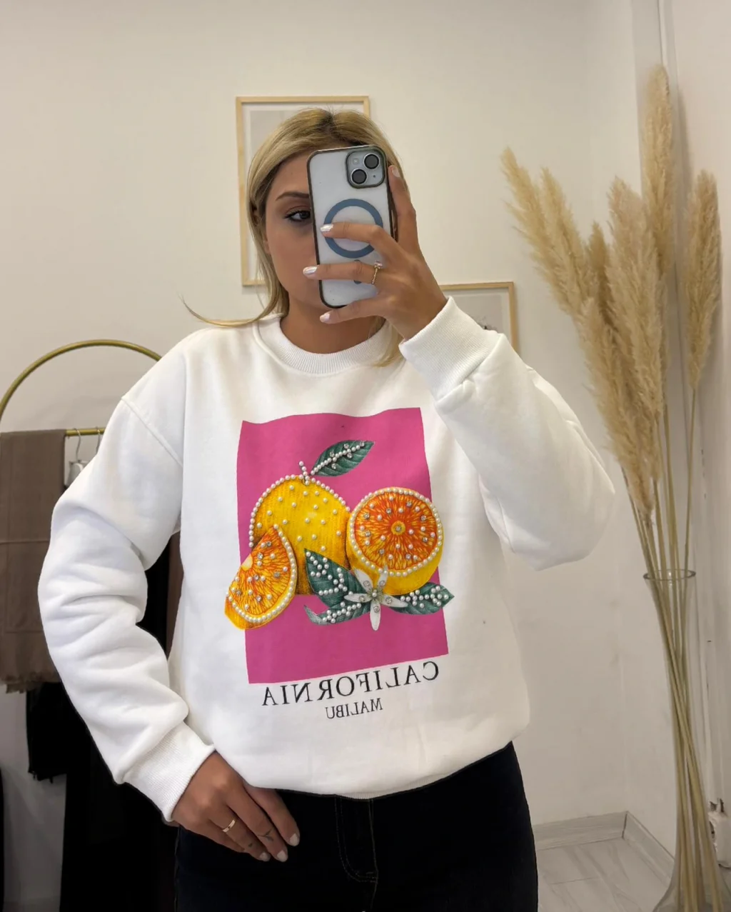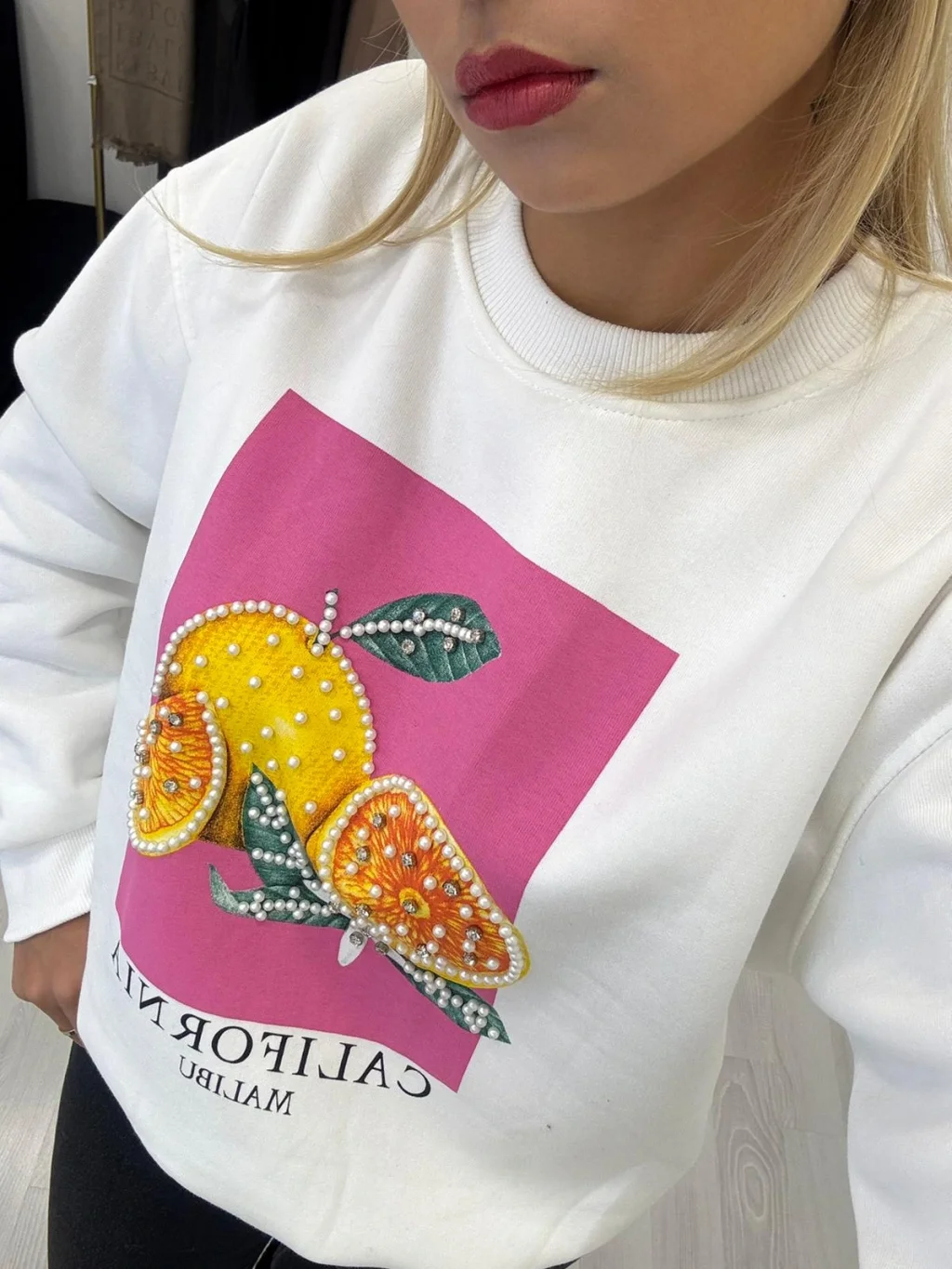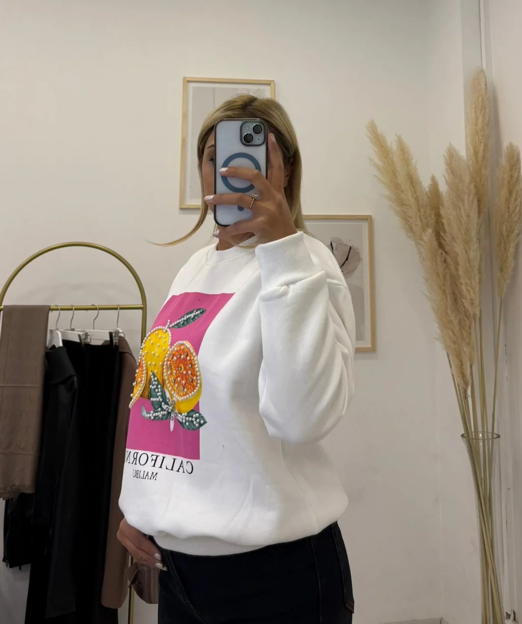 Kalın ve yumuşak şardonlu kumaştan yapılmış, oversize (bol kesimli) Beyaz sweatshirt. Önünde canlı pembe zemin üzerinde, sim/inci/pul detaylarıyla süslenmiş parlak ve dikkat çekici meyve (narenciye) grafik baskısı bulunur. Konforlu ve iddialı bir günlük parça.