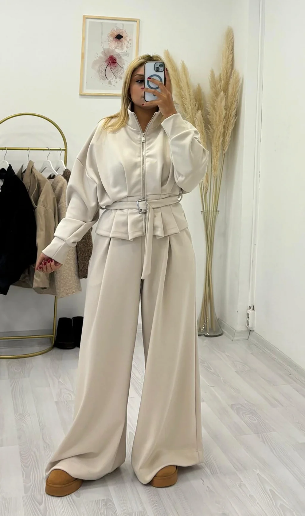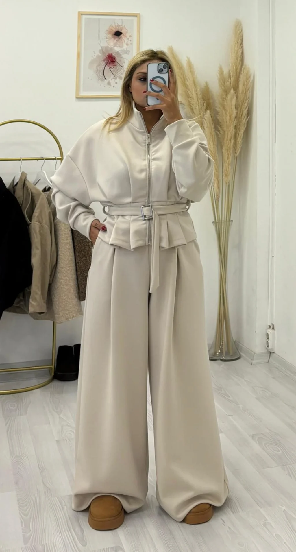 Kemer Detaylı Fermuarlı Üst ve Geniş Paça Pantolon Takımı ile tek parçada zahmetsiz, modern ve sofistike bir stil yakalayın. Takım, özel günlerden şık ofis ortamlarına kadar geniş bir kullanım alanı sunar.