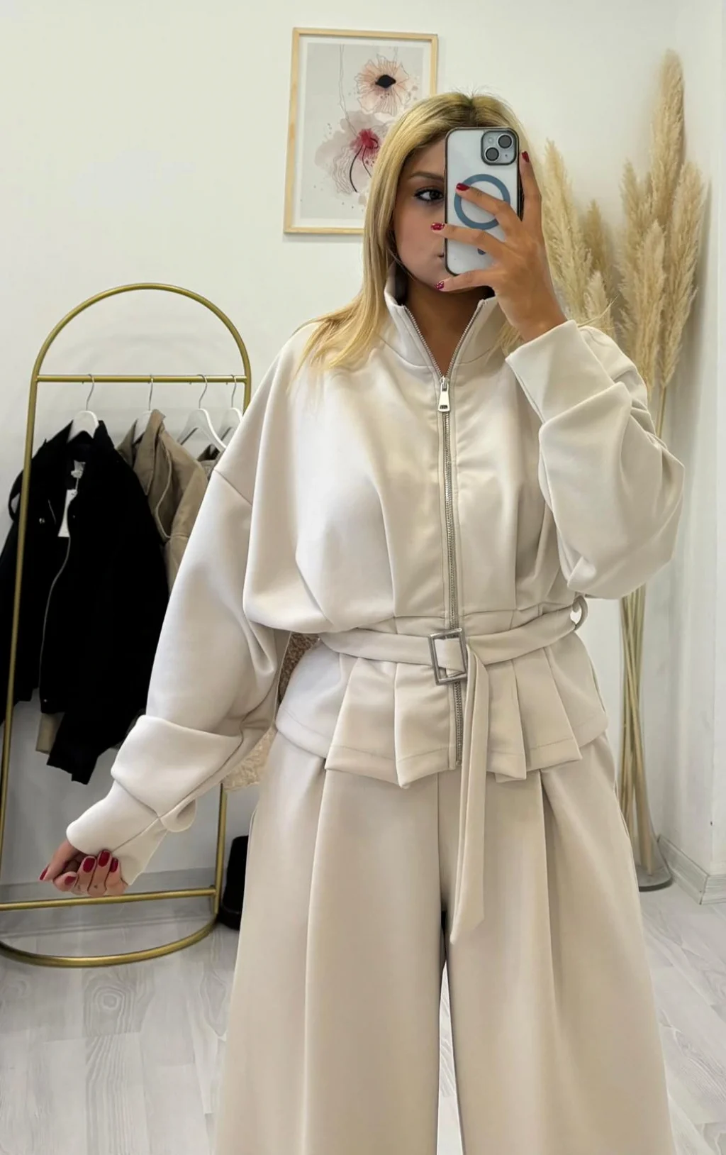 • Üst Parça (Ceket): Fermuar detaylı, yüksek (dik) yaka kesimine sahiptir. Düşük omuzlu ve rahat (oversize) kalıbı, modern bir silüet çizer. Kendi kumaşından yapılmış geniş kuşak/kemer detayı, üst kısmı toplayarak bele oturmasını sağlar ve peplum benzeri bir görünüm yaratır.