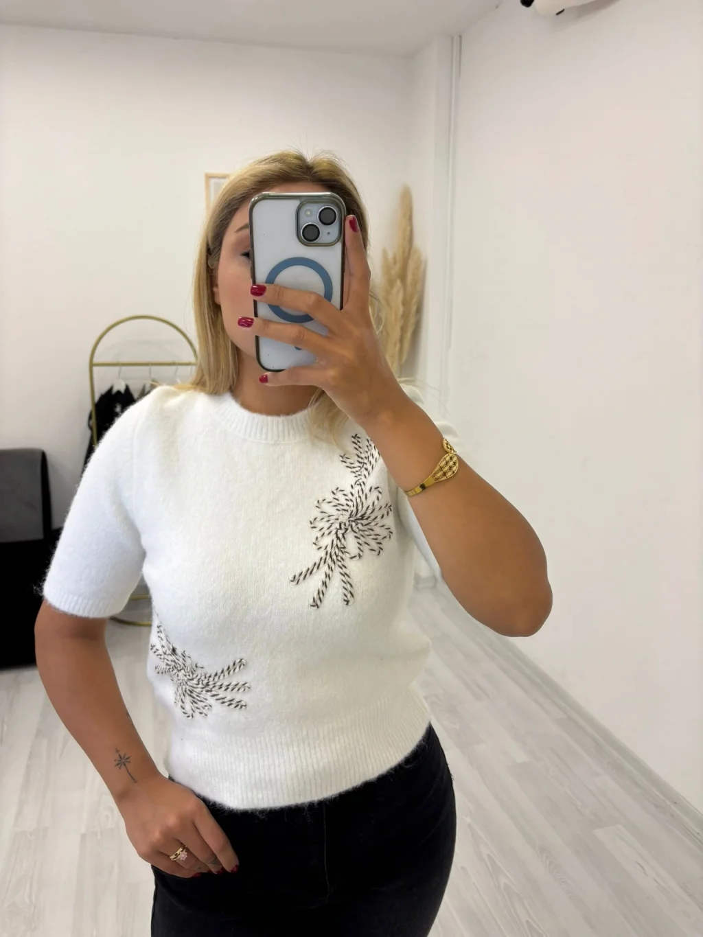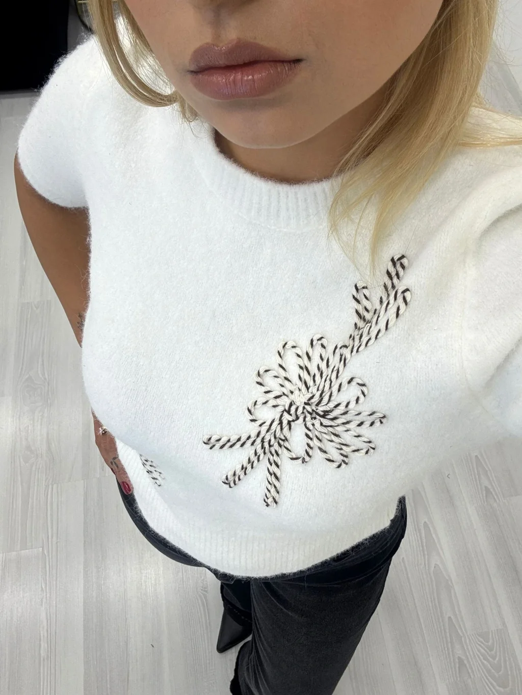 Yumuşak dokulu, bisiklet yaka, kısa kollu beyaz triko kazak. Ön yüzeyinde kahverengi ipliklerle yapılmış stilize nakış (veya işleme) detayları bulunur. Geçiş mevsimleri için ideal şıklık