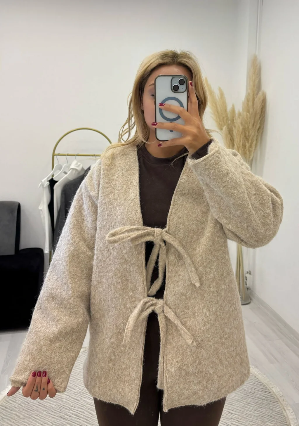 Yumuşak ve tüylü (shaggy) dokuya sahip, önü kendi kumaşından bağlama detaylı, rahat kesimli (oversize) triko hırka. Kış aylarının trend parçası. Kahve ve bej renk seçenekleriyle."
