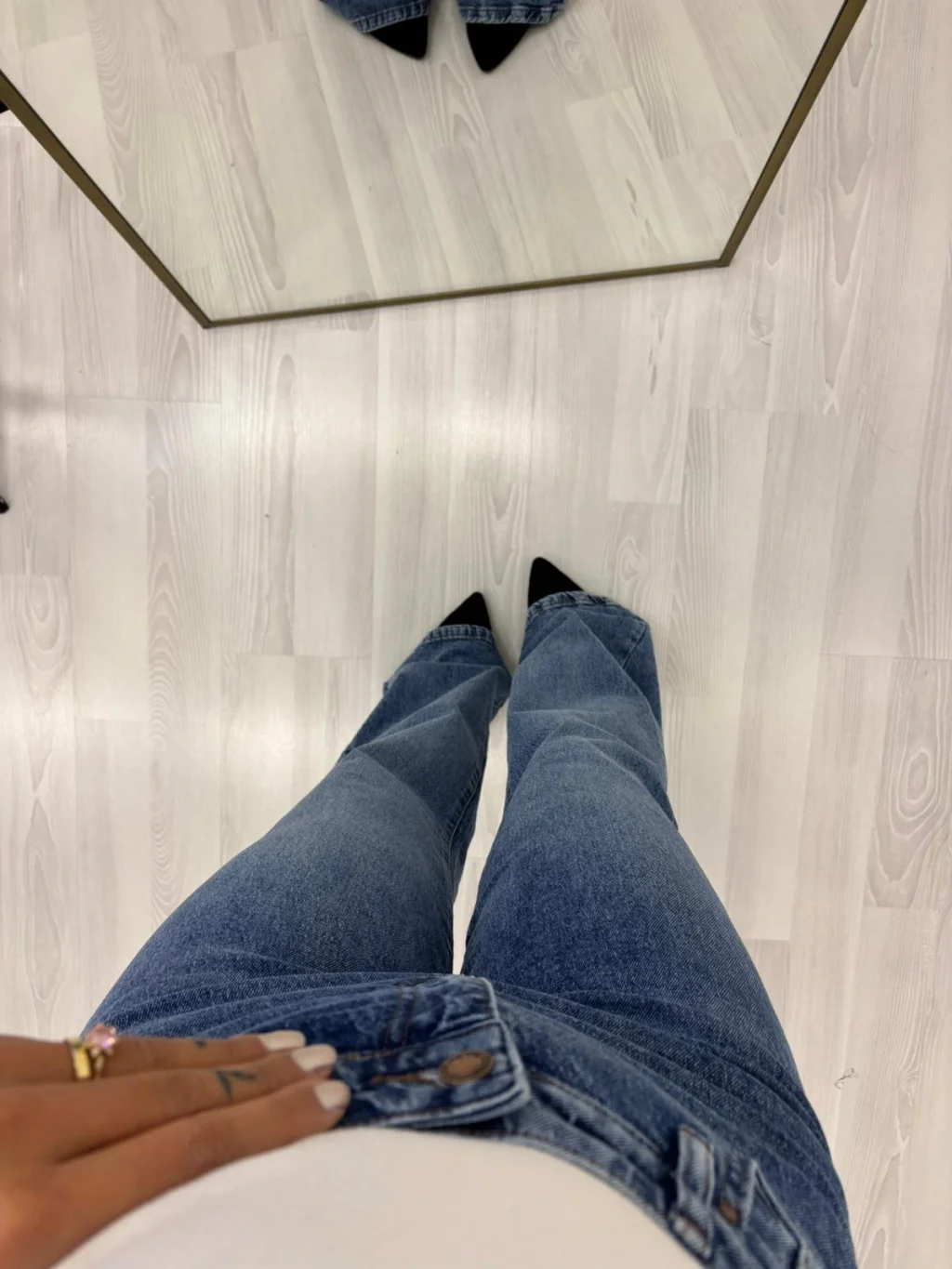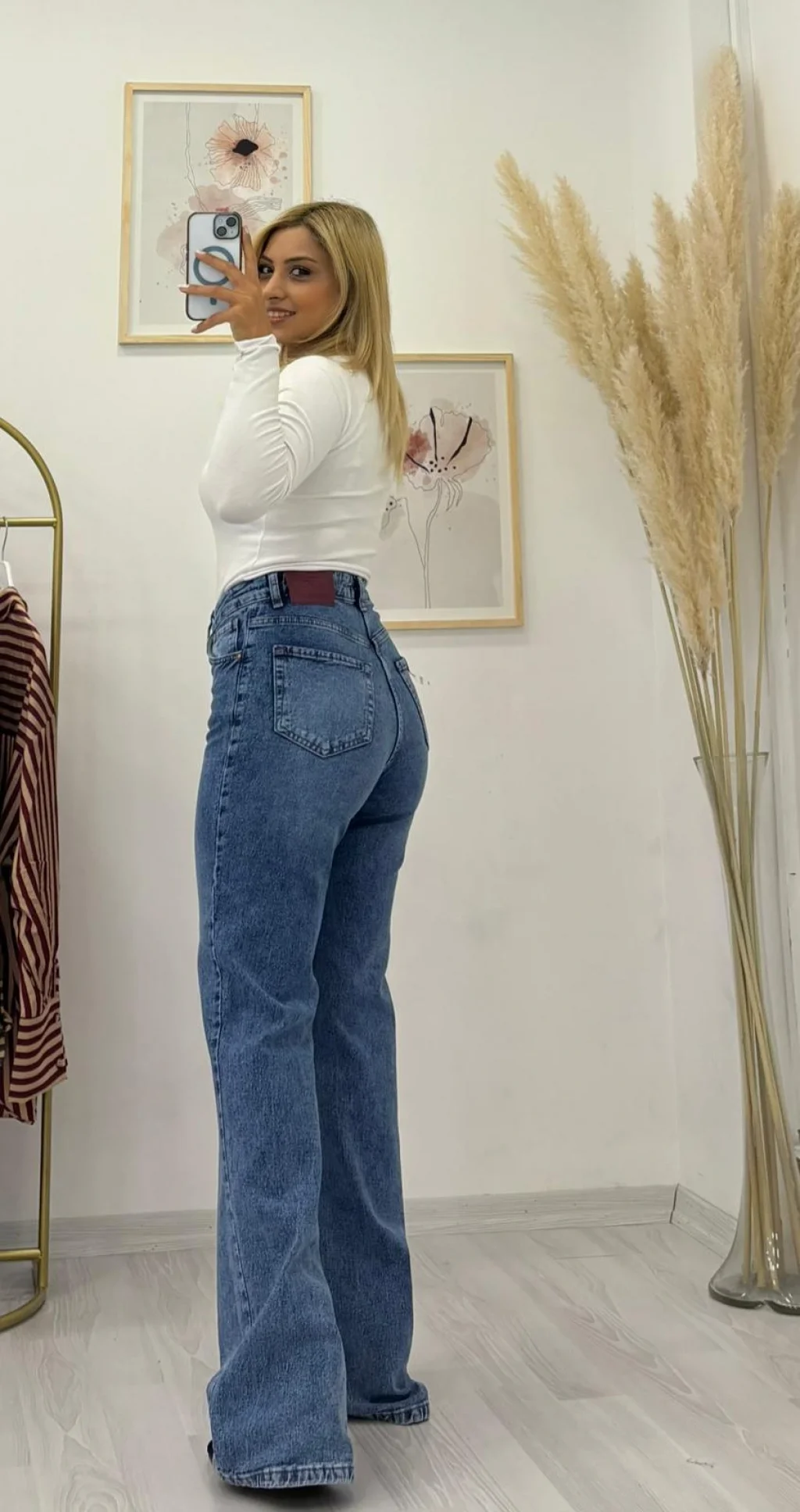Yumuşak dokulu, orta mavi soft yıkamalı denim kumaşından yapılmış jean pantolon. Vücudu saran yüksek bel ve paçaya doğru hafifçe açılan düz/hafif çan kesimiyle modern bir görünüm sunar.