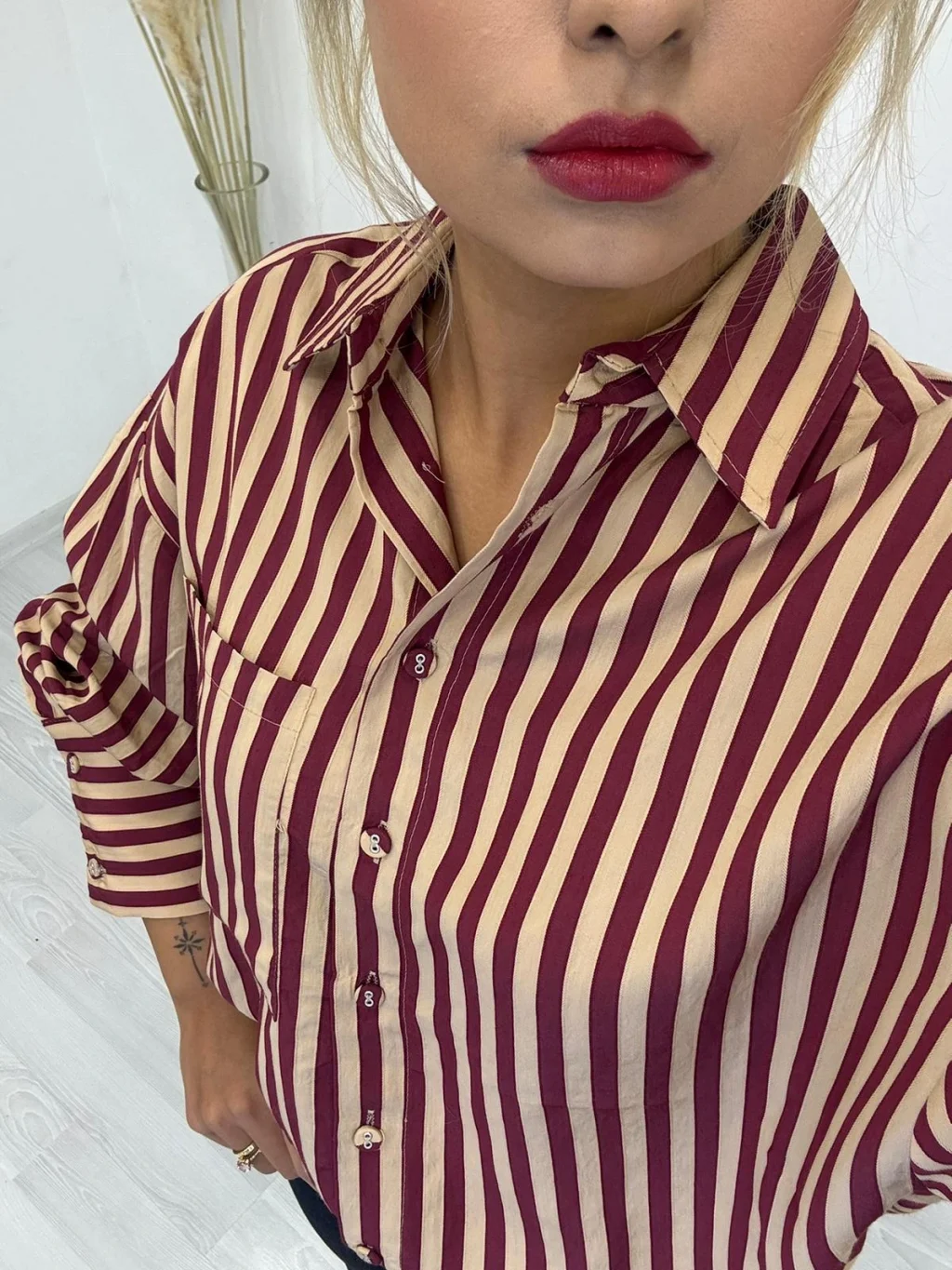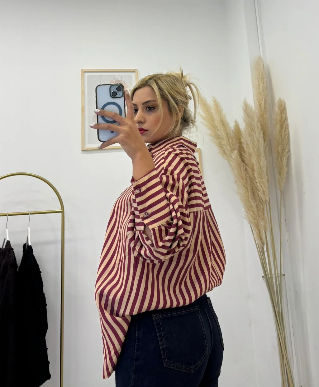 Krem (Bej) zemin üzerinde canlı Bordo (Vişne Çürüğü) dikey çizgilerle tasarlanmış oversize (bol) gömlek. Düşük omuzlu, geniş kesimli ve manşetli uzun kollarıyla hem şık hem de rahat bir stil sunar.